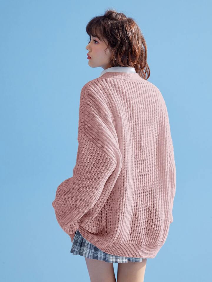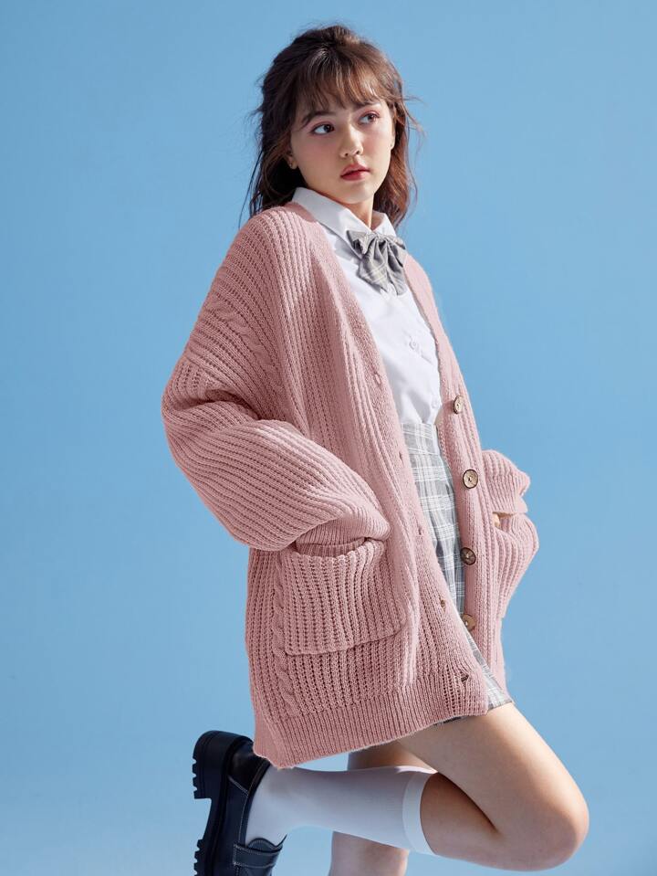 Kawaii Cárdigan de manga caída con bolsillo parche, tops de manga larga para la escuela
