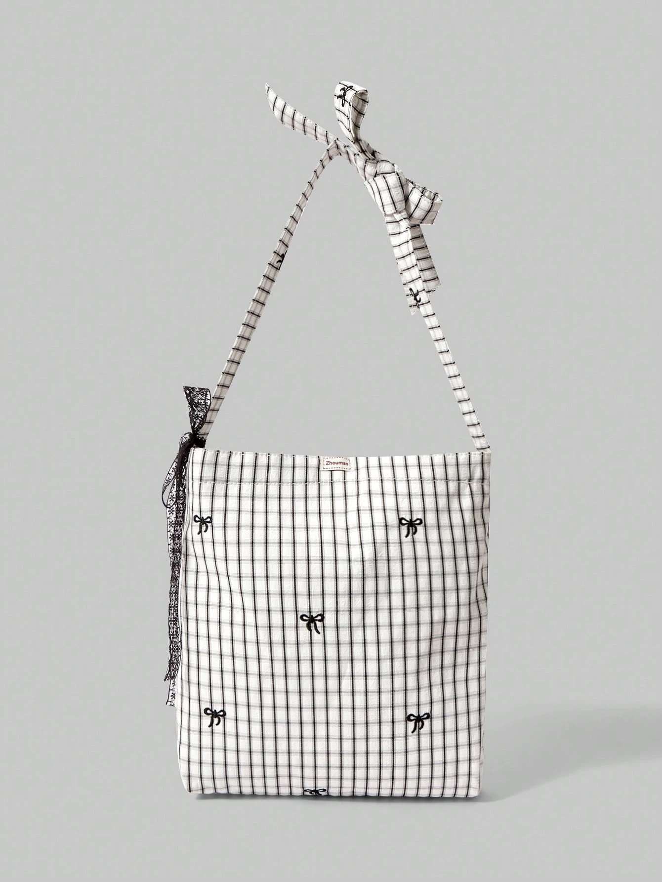 Kawaii Bolso de tela con lazo a contraste, de un solo hombro y hombro sesgado, bolso de mujer universitaria