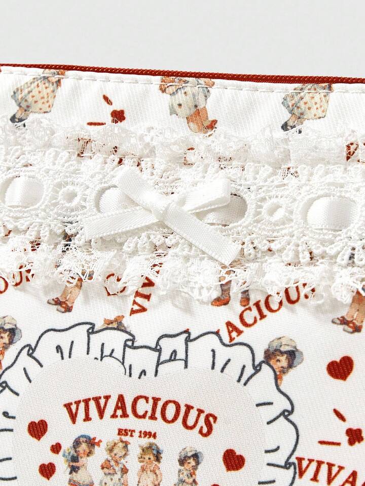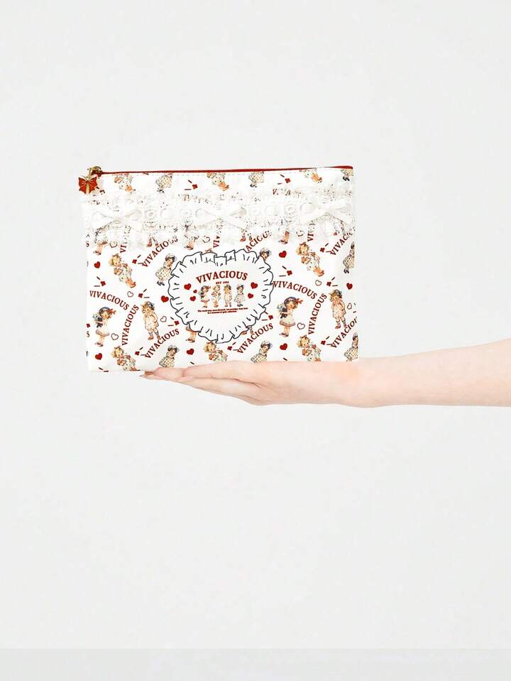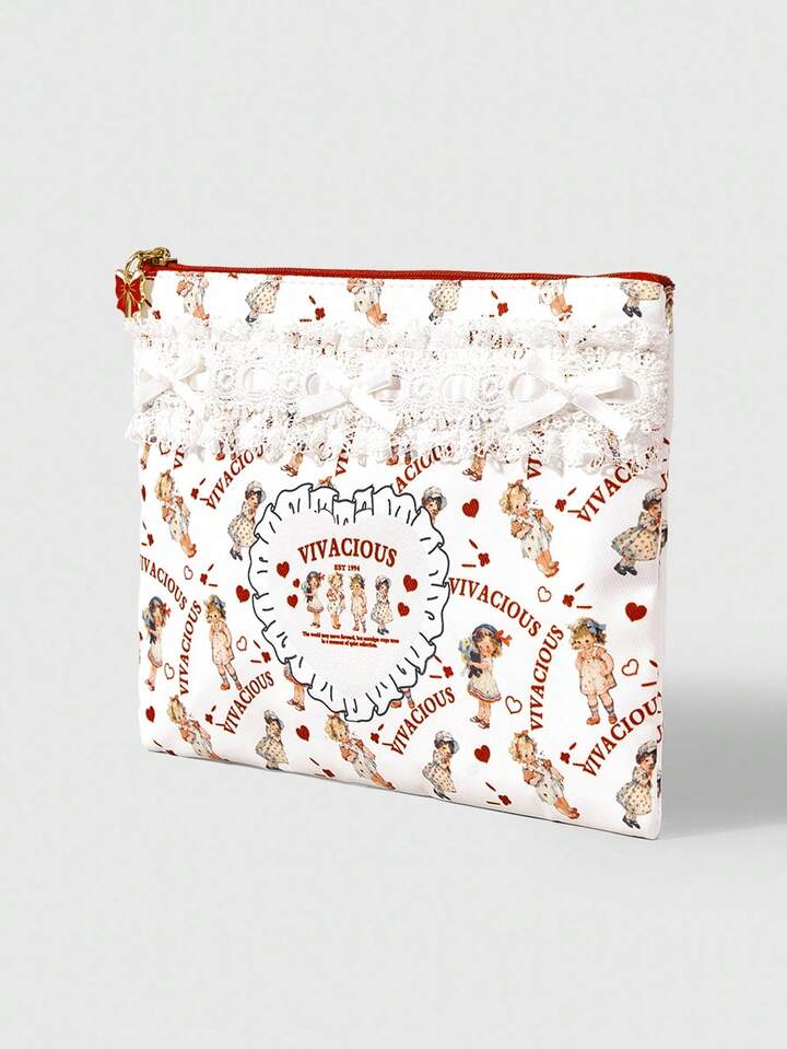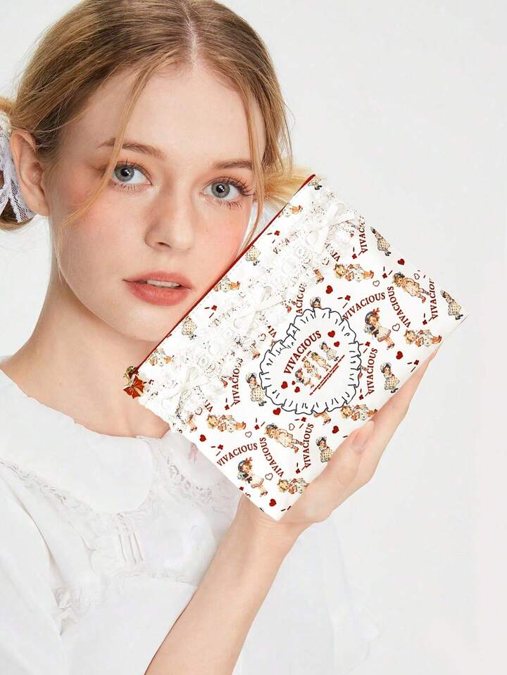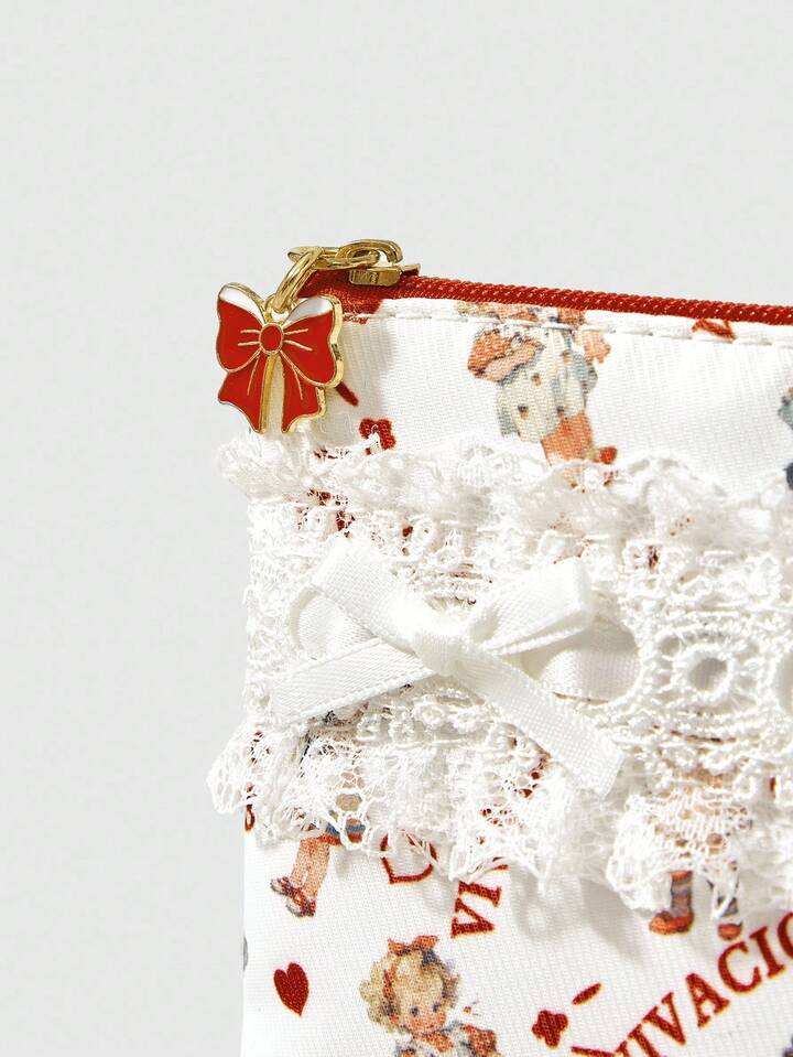 Kawaii Bolsa de maquillaje con función de almacenamiento, con patrón de mariposa y niña en encaje en todo el diseño