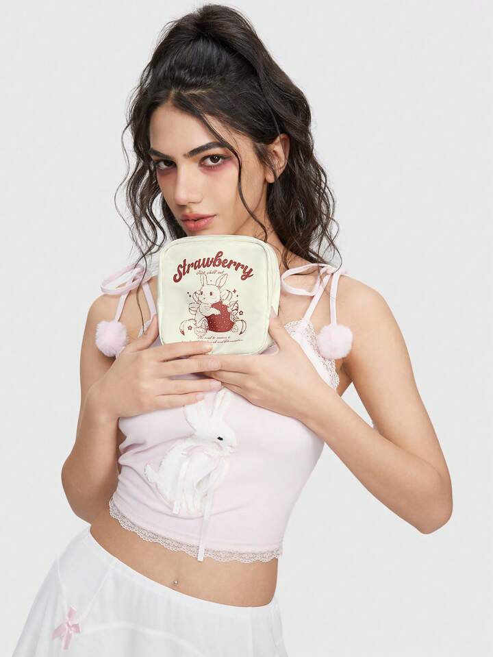 Kawaii Moderna y elegante bolsa cuadrada de gran capacidad con diseños de caricatura clásica de fresa, conejo, letra inglesa en relieve y cremallera portátil para cosméticos 605491