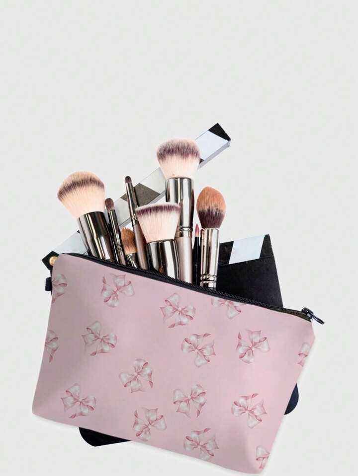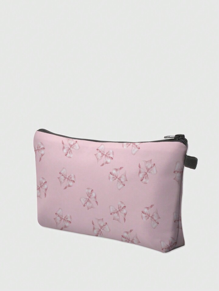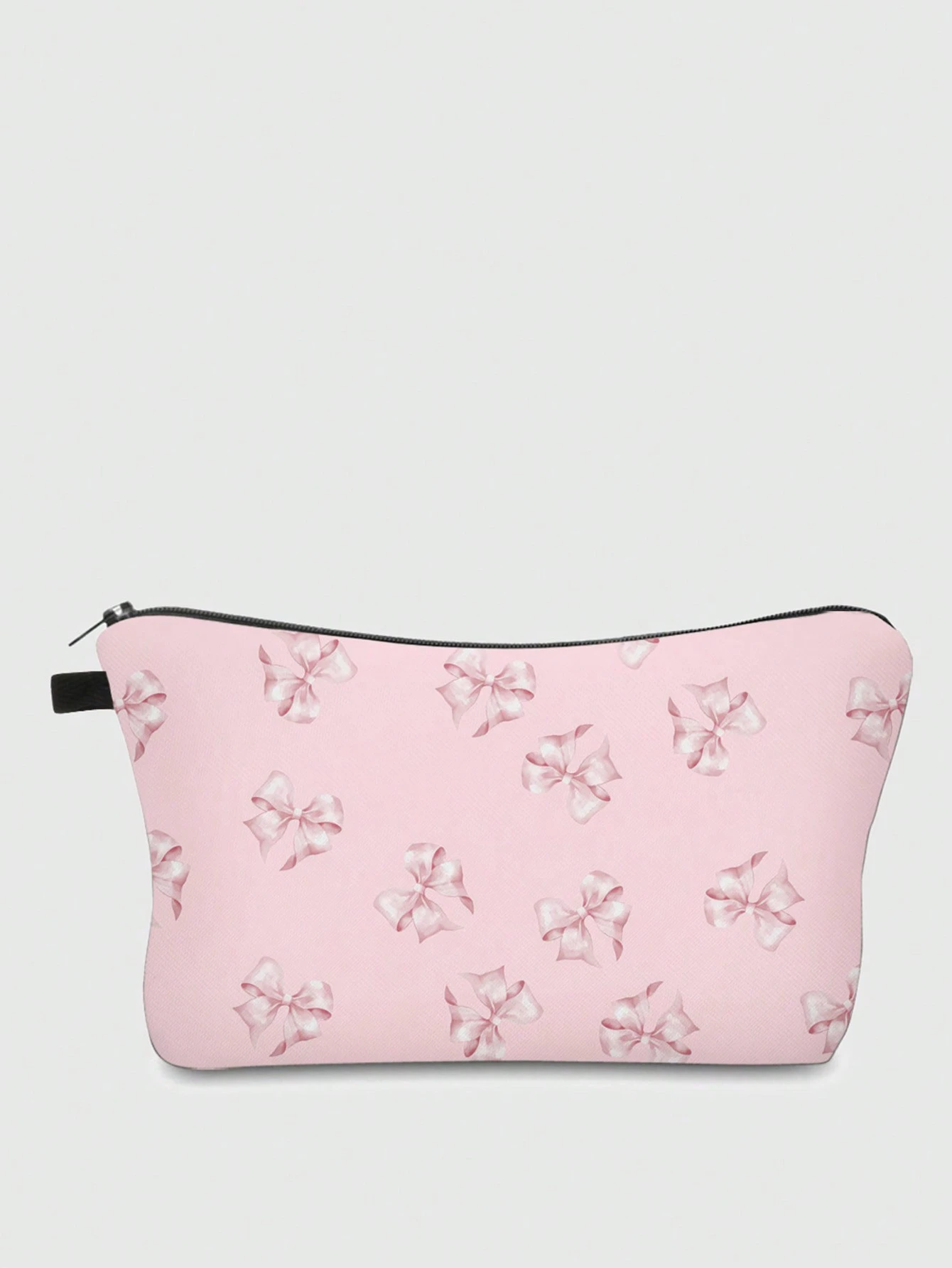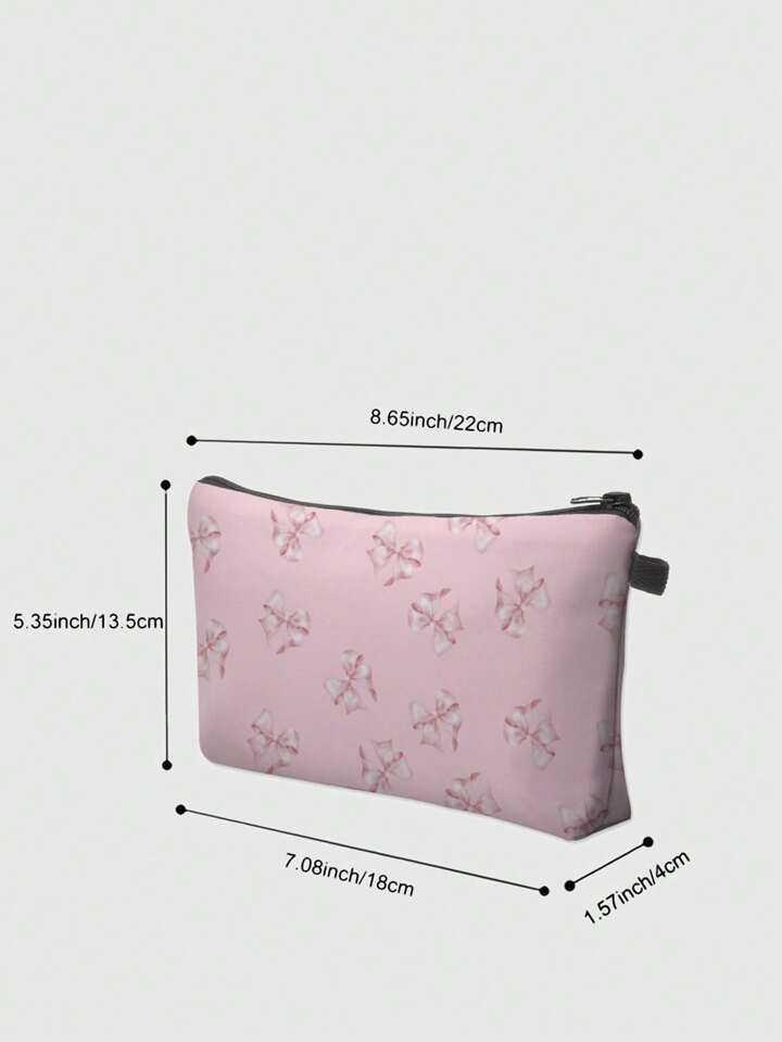 Kawaii Bolsa de cosmética con cremallera, organizador de maquillaje, bolso de aseo para viajes, diseño floral #401422 con lazo rosa, hecho de poliéster, regalo ideal para vacaciones