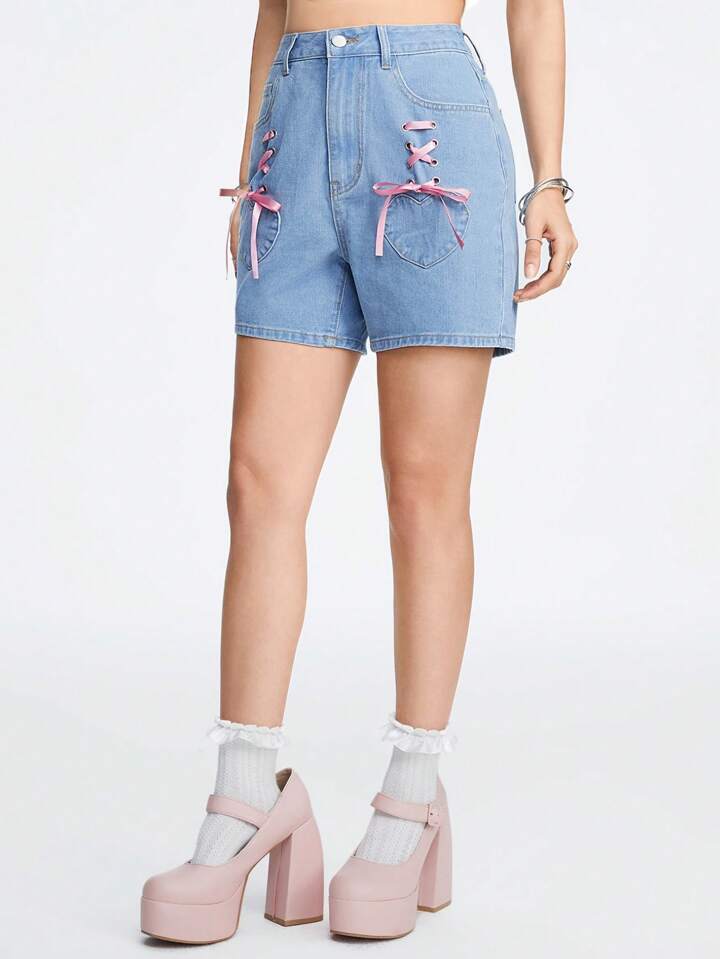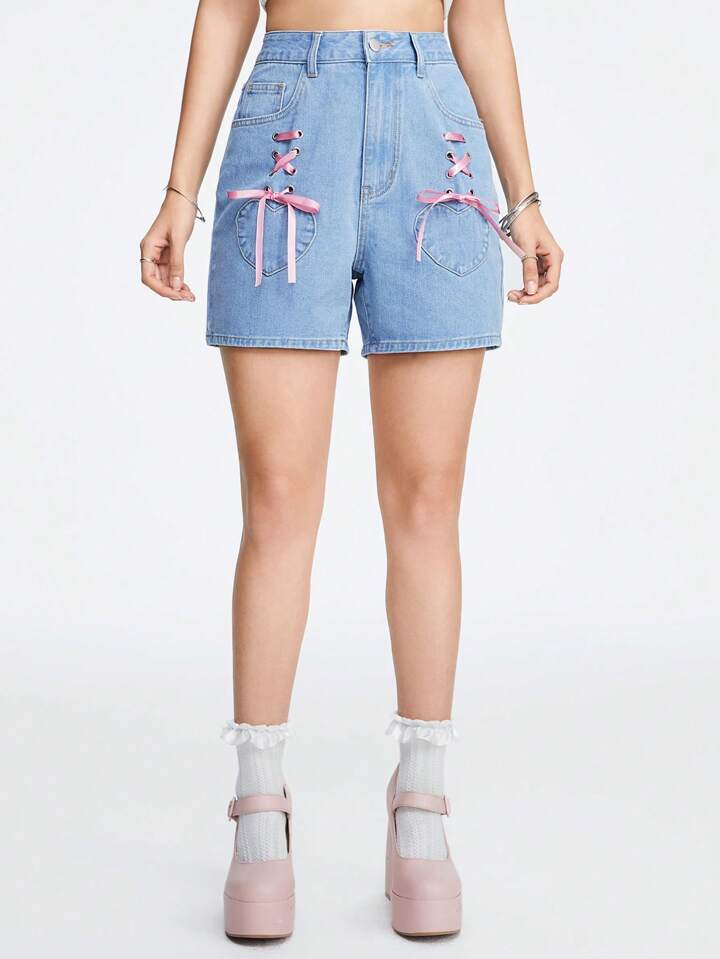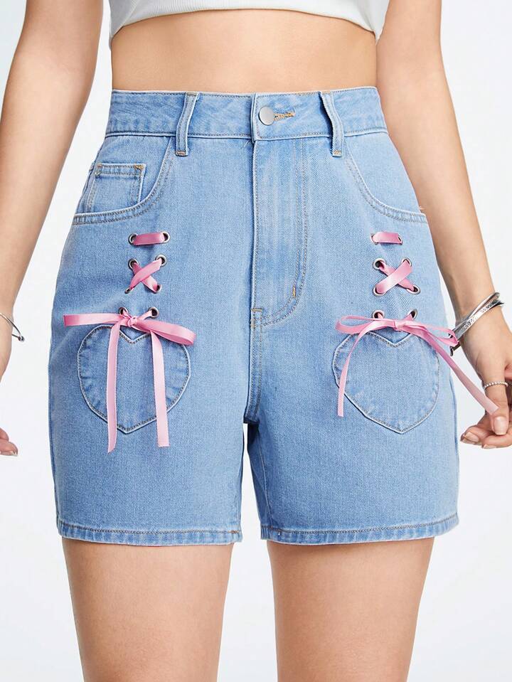 Kawaii Shorts de mezclilla de mujer con diseño de corazones y lazo en teñido anudado estilo de trabajo fresco y encantador con bolsillos