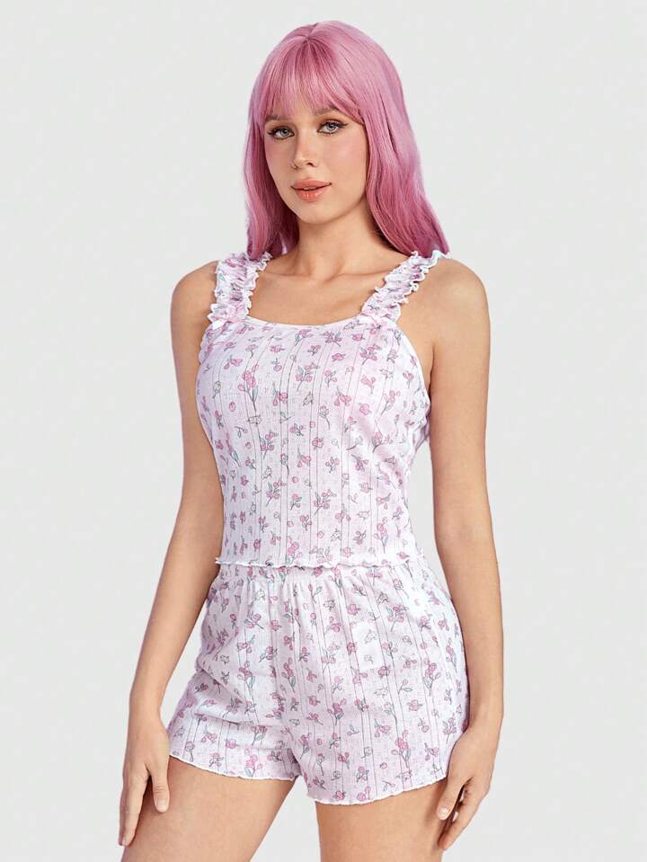 Kawaii Conjunto de camisola de pijama de flores rosadas frescas para mujeres