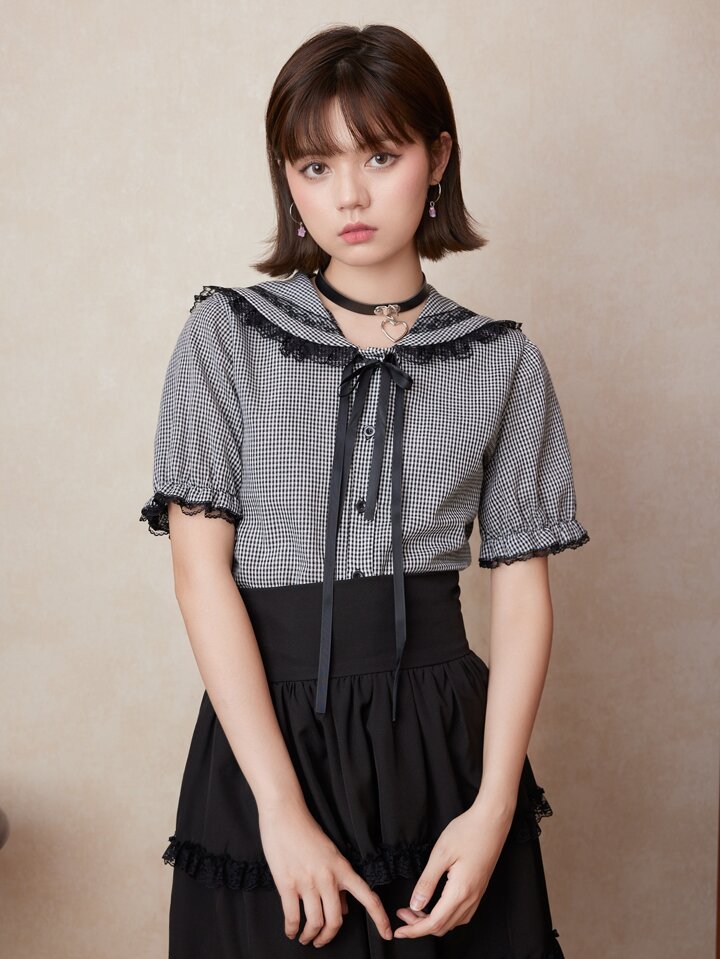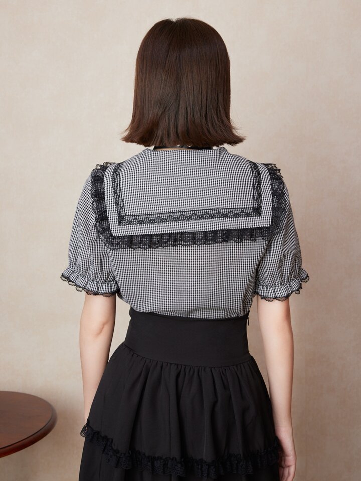Kawaii Blusa con cuello marinero, con volantes a cuadros, para la escuela