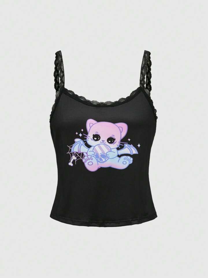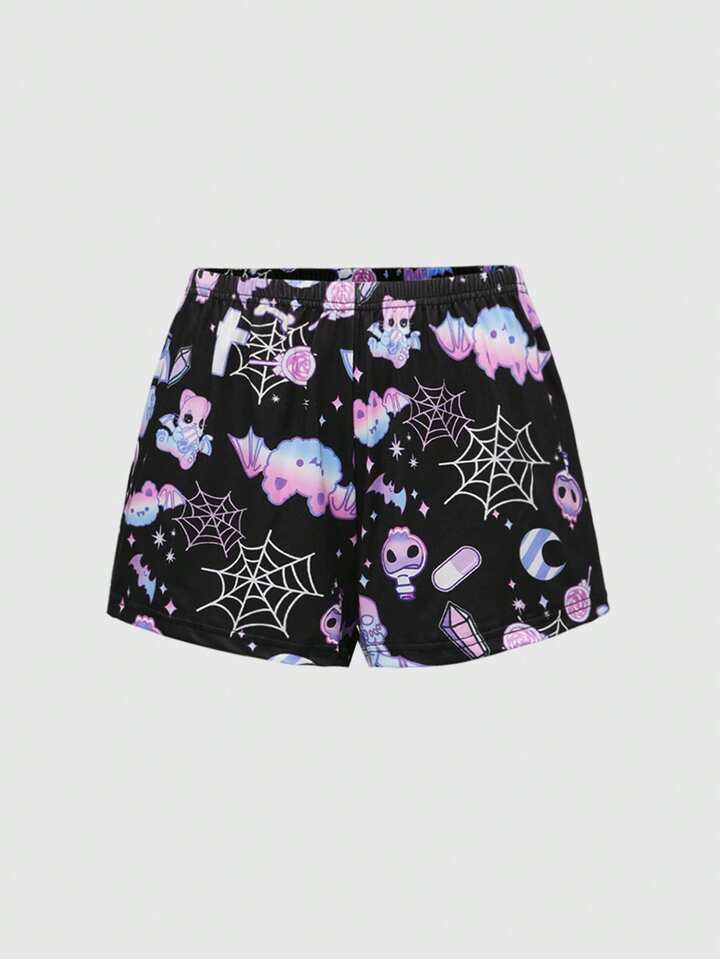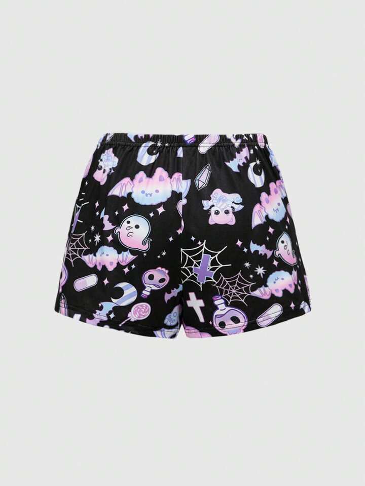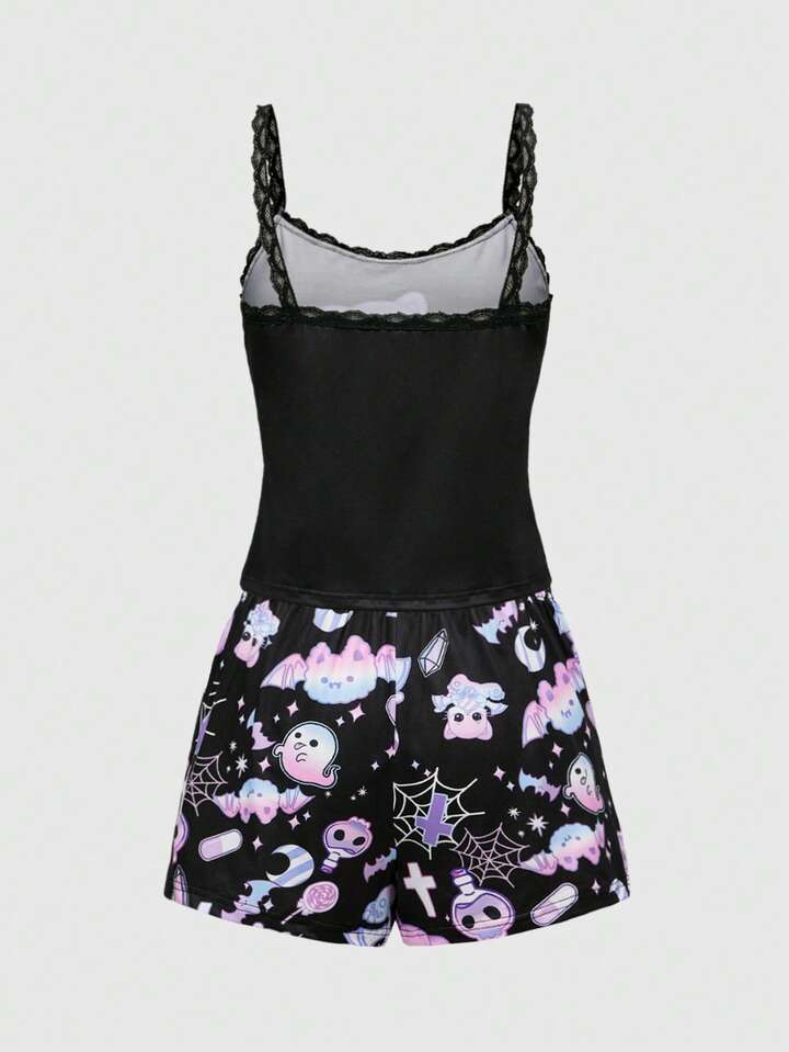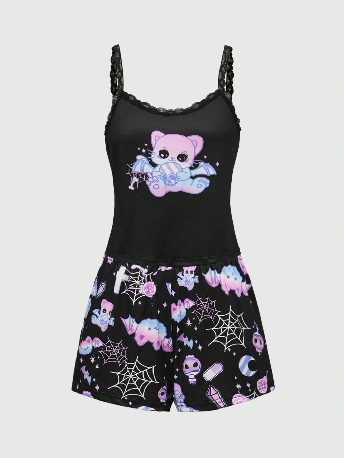 Kawaii Conjunto de pijama lindo y divertido con camiseta de encaje con estampado completo de murciélago, gato, cruz y calavera, y shorts