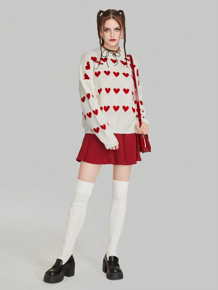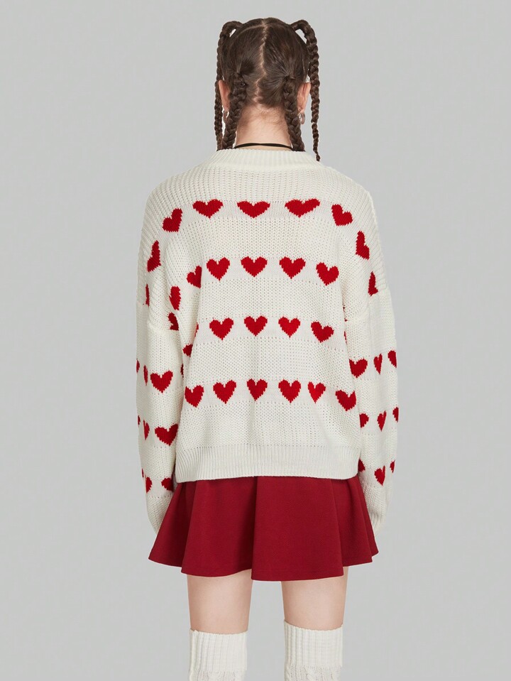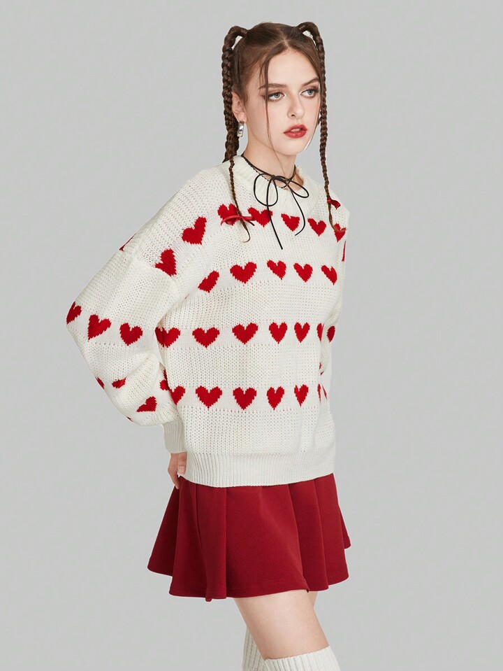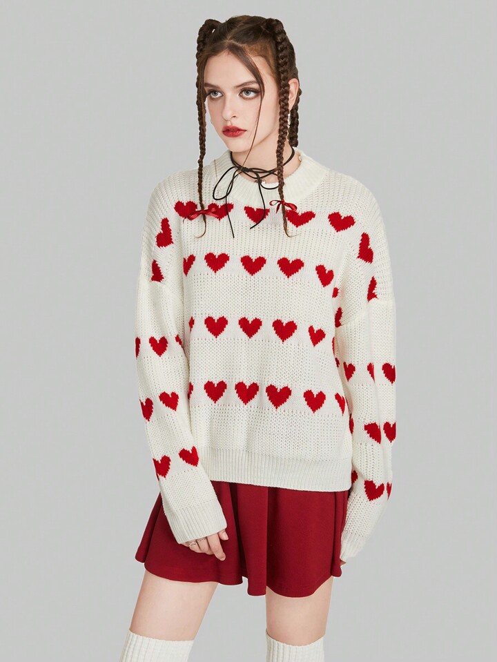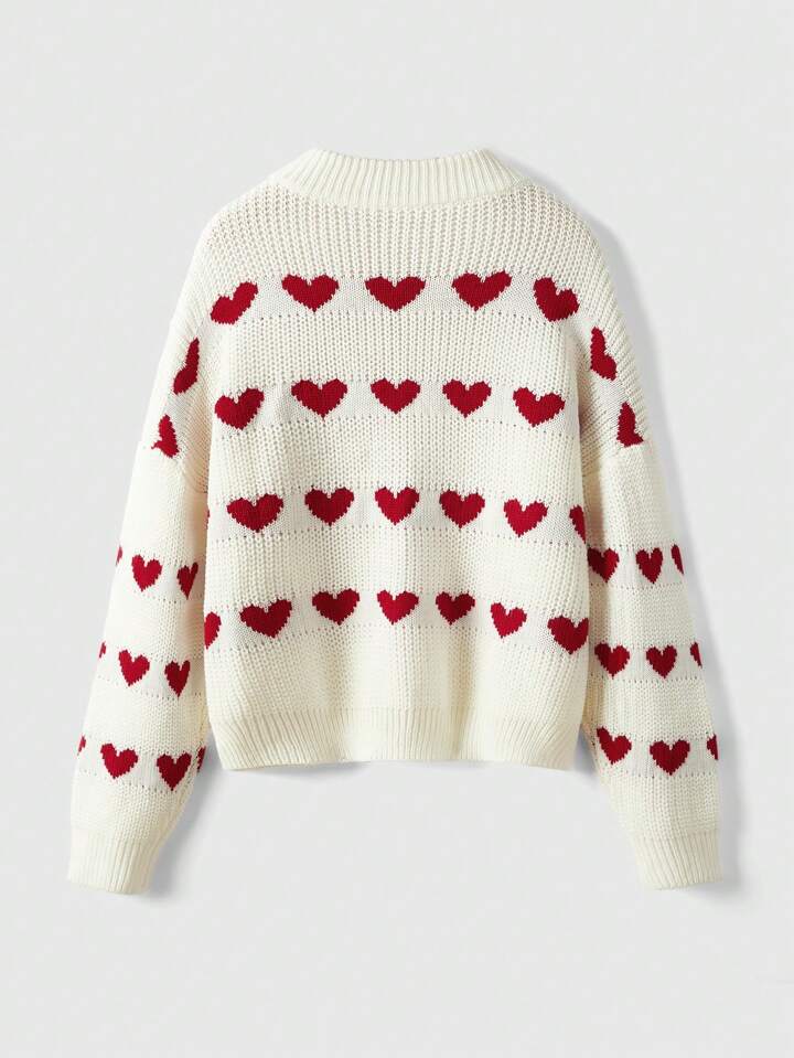 Kawaii Suéter de hombros caídos con patrón de corazón, blusas de manga larga
