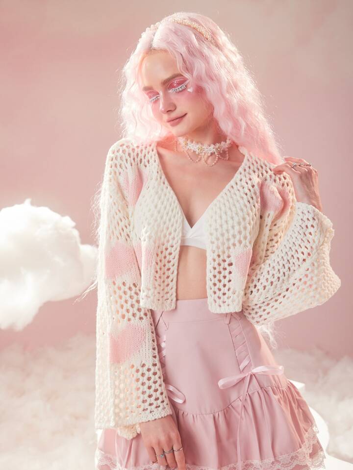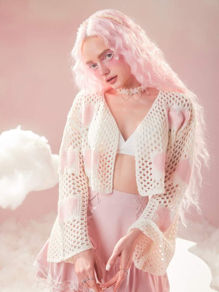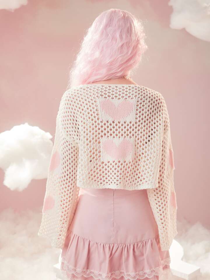 Kawaii Cárdigan con patrón de corazón tejido abierto