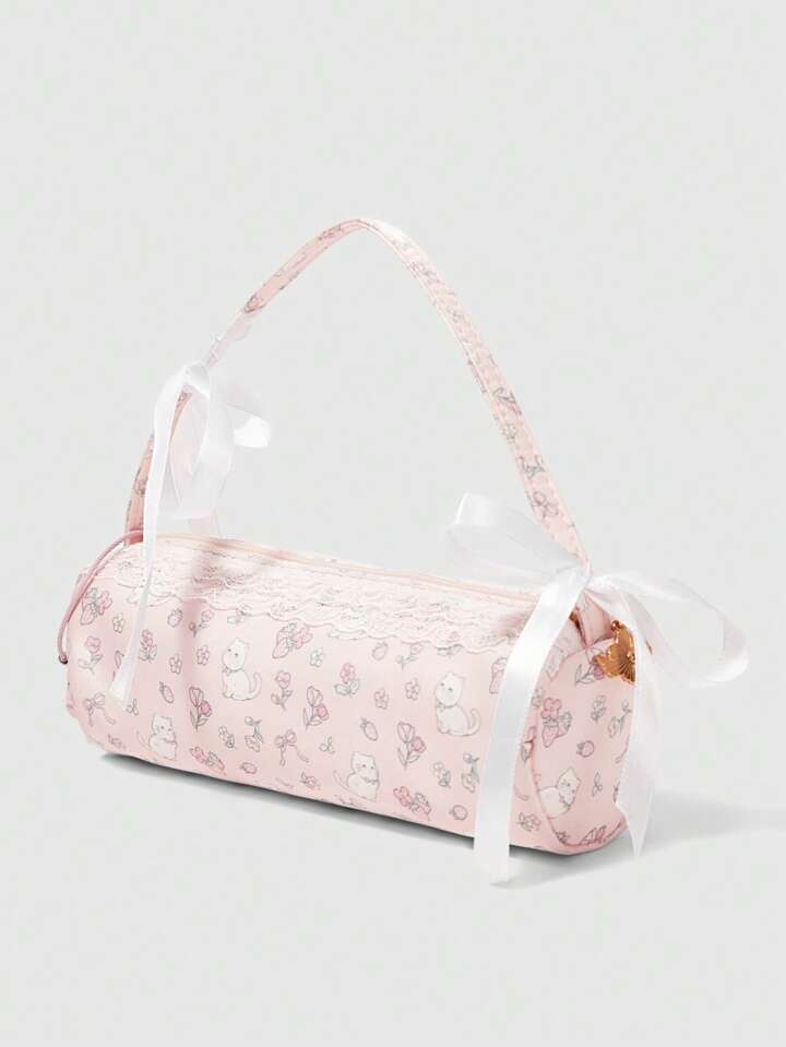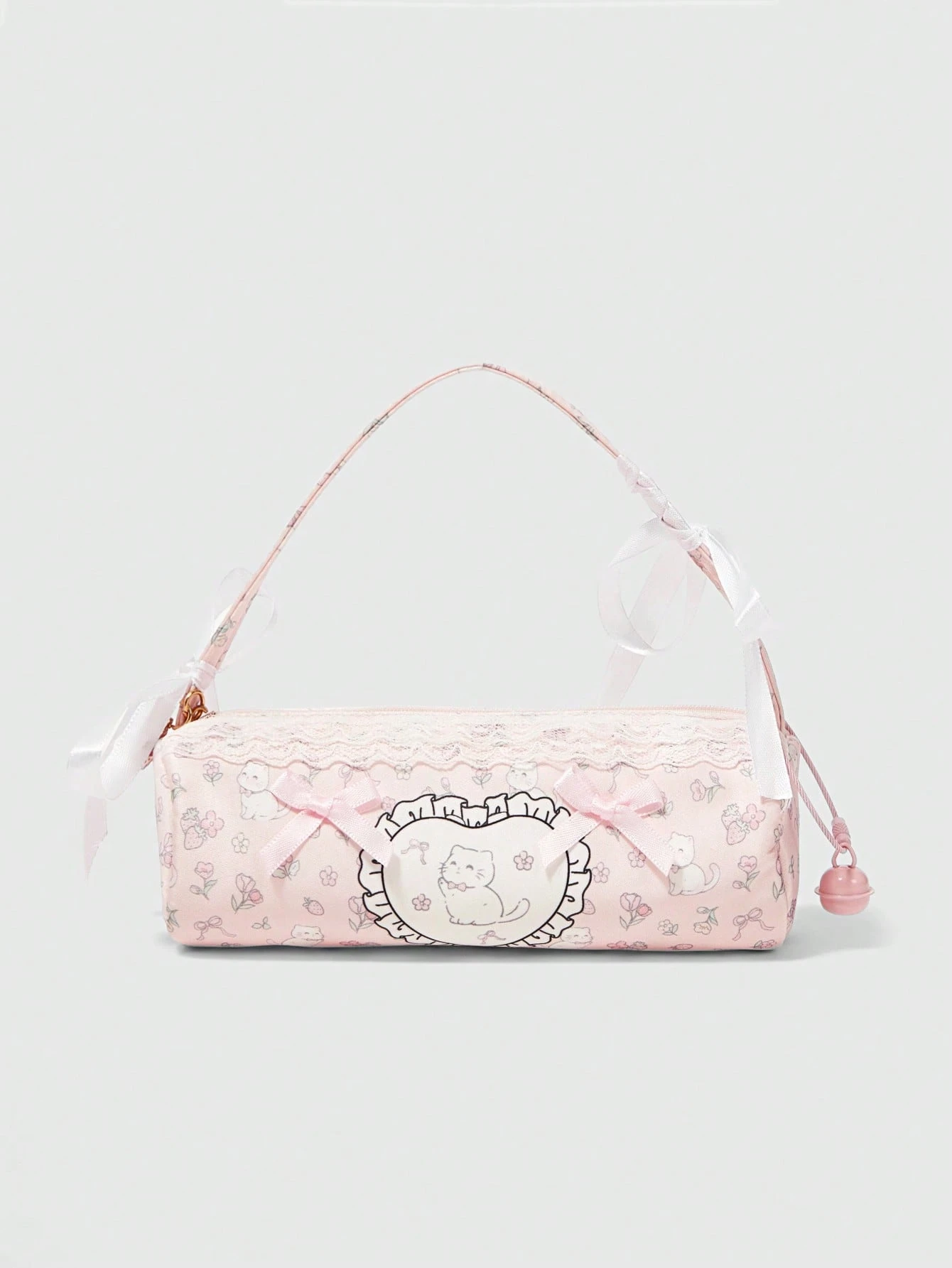 Kawaii Bolsa cosmética compacta con patrón de gato blanco y lazo con aplicación en forma de corazón, organizador de joyas, 999058