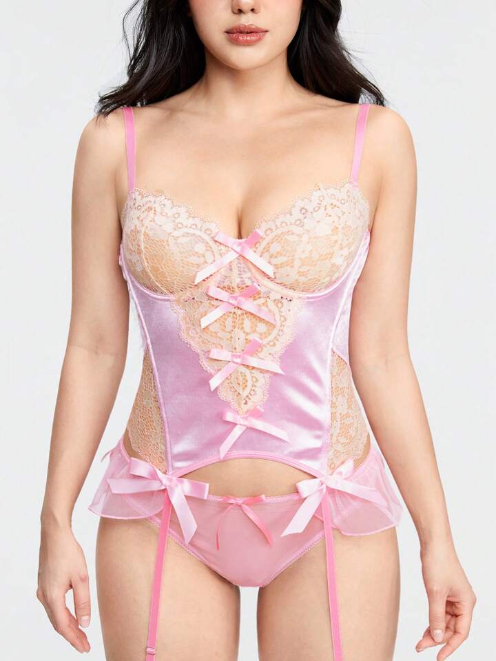Kawaii Corsé De Satén Decorado Con Panel De Encaje, Lazo Y Sujetador Con Aros, Con Correas De Hombro Ajustables