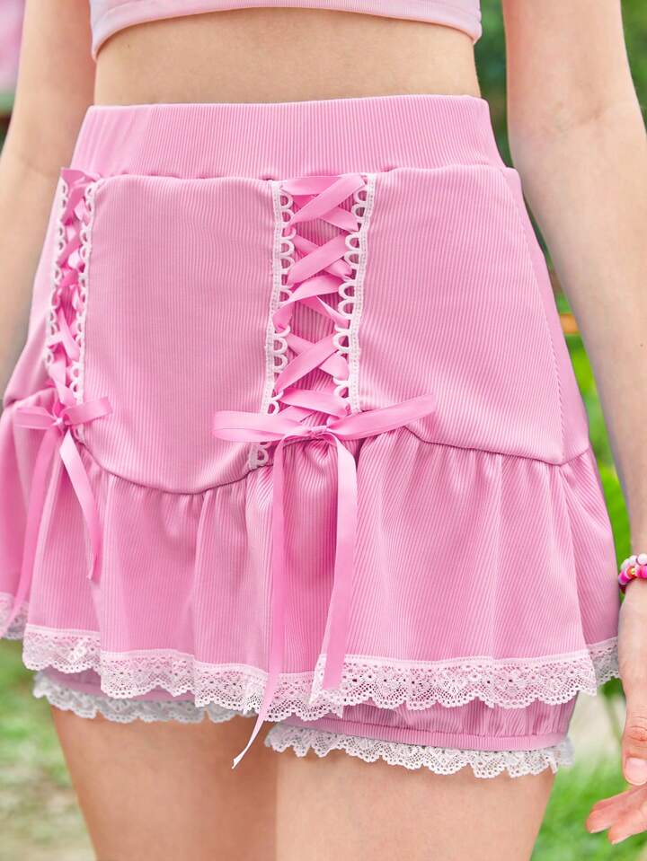 Kawaii Skort con cordón con encaje en contraste bajo con fruncido