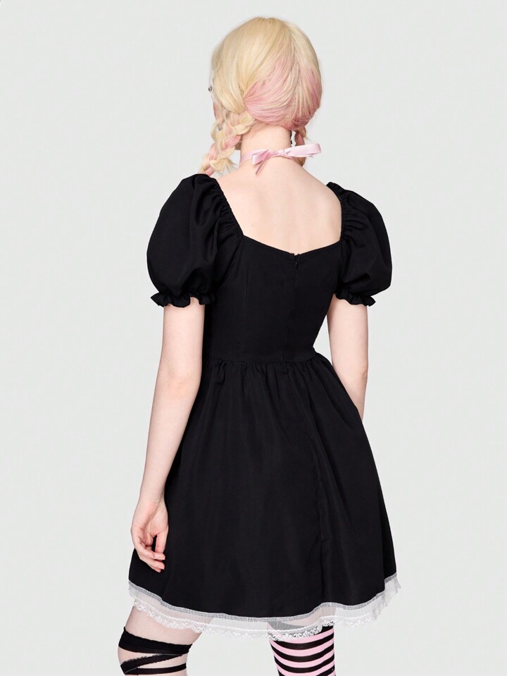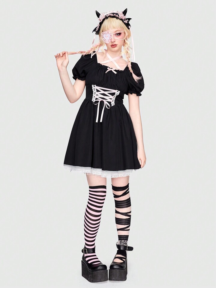 Kawaii Vestido con cordón delantero de hombros descubiertos ribete con encaje