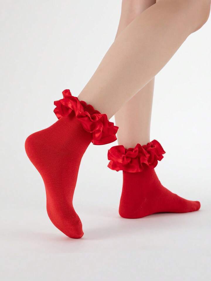 Kawaii Calcetines rojos elegantes de volantes hasta la pantorrilla para mujer, aptos para uso diario