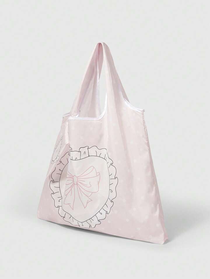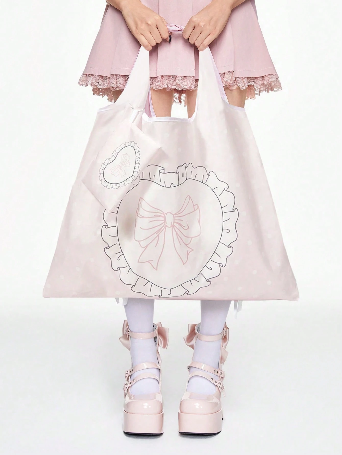 Kawaii Bolso de tote plegable de gran capacidad con diseño de lazo de encaje con mariposa y corazón, incluye bolsillo con cremallera - SKU 1387368