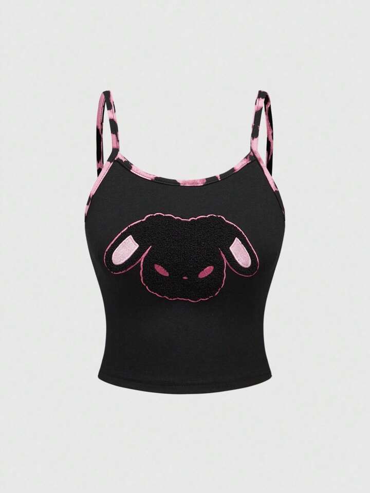Kawaii Camiseta de tirantes finos con estampado de leopardo, suave y esponjoso con bordado de conejo oscuro