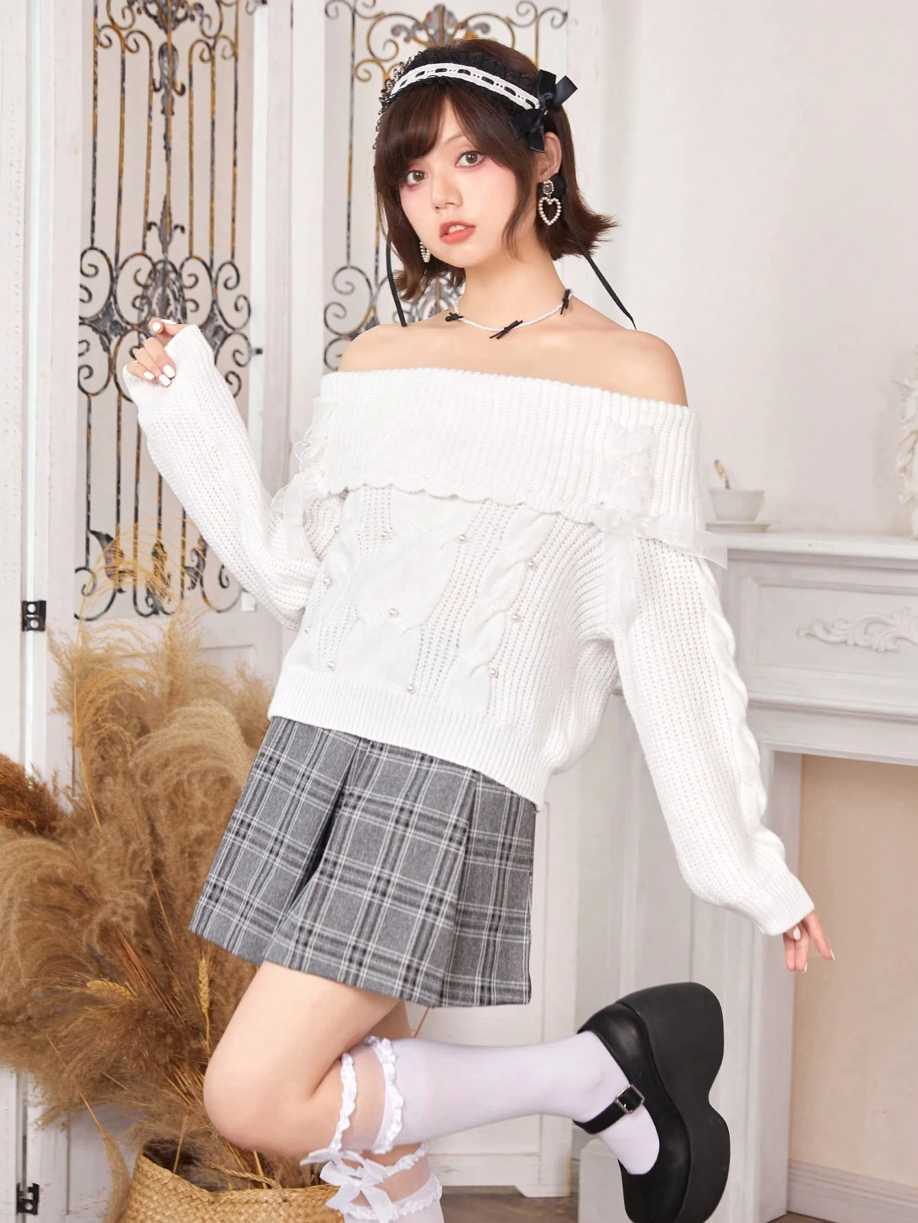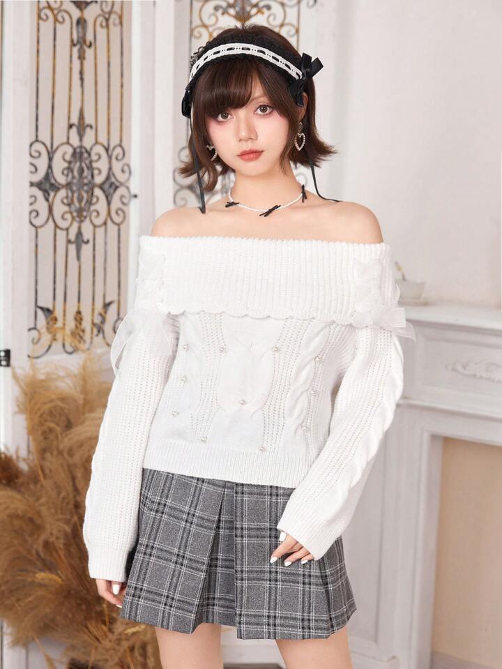 Kawaii Jersey de hombros descubiertos doblado tejido de cable