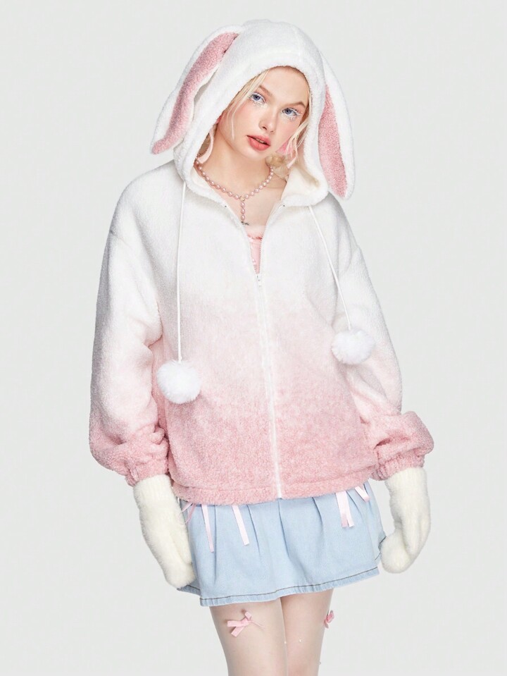 Kawaii Abrigo de ombré con diseño de oreja 3D con diseño de pompón con capucha con forro teddy