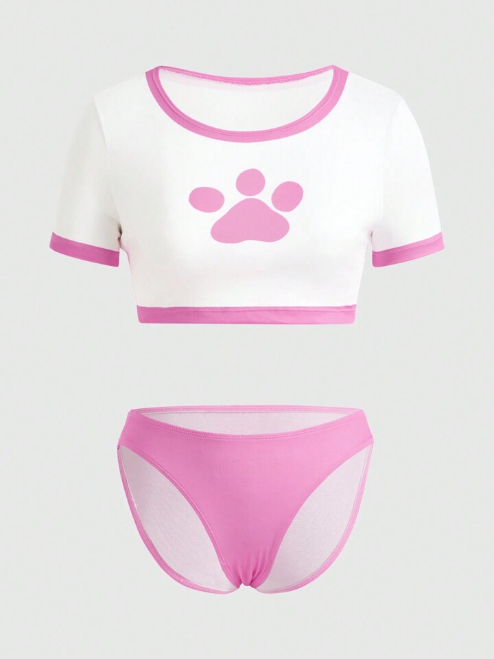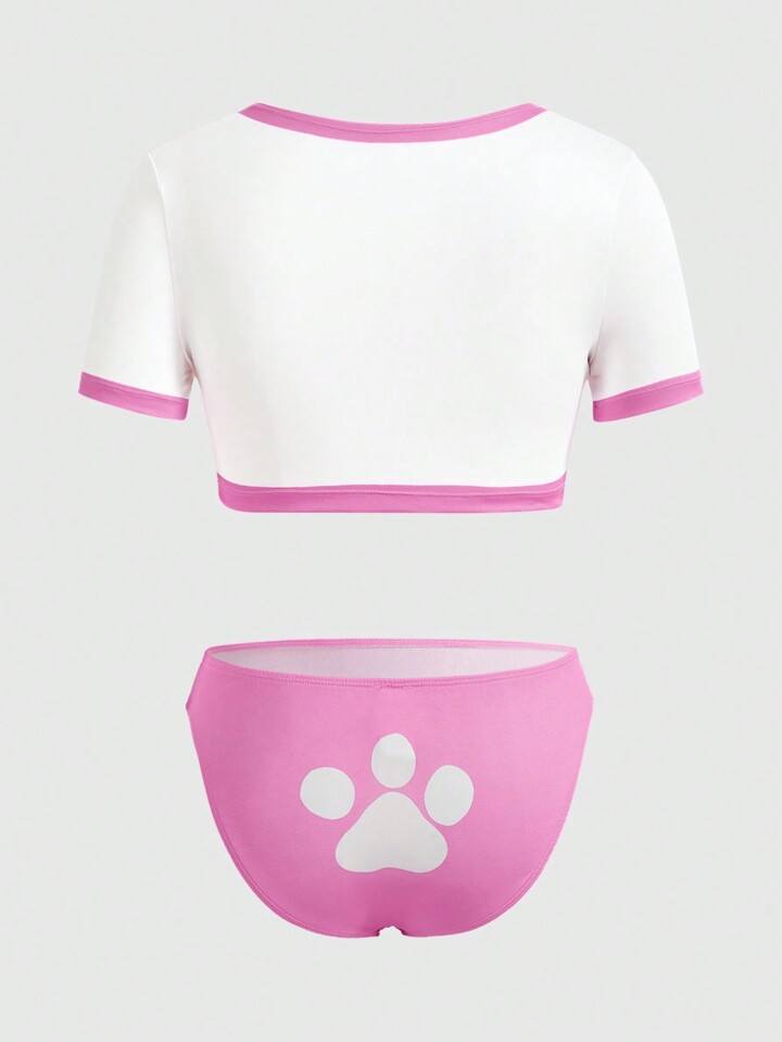 Kawaii Set de lencería con estampado de garra unido en contraste