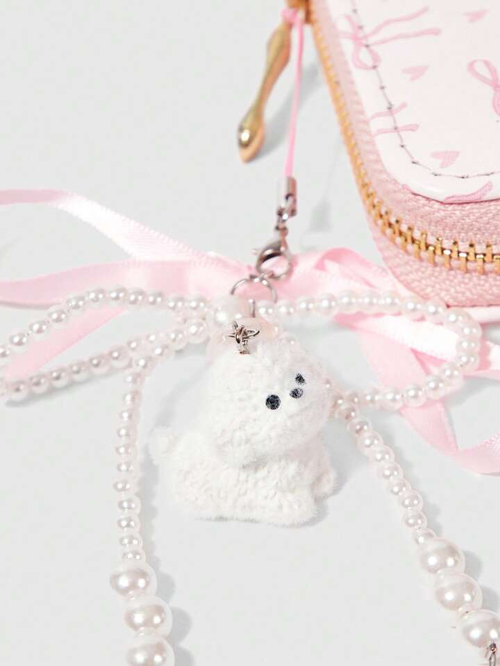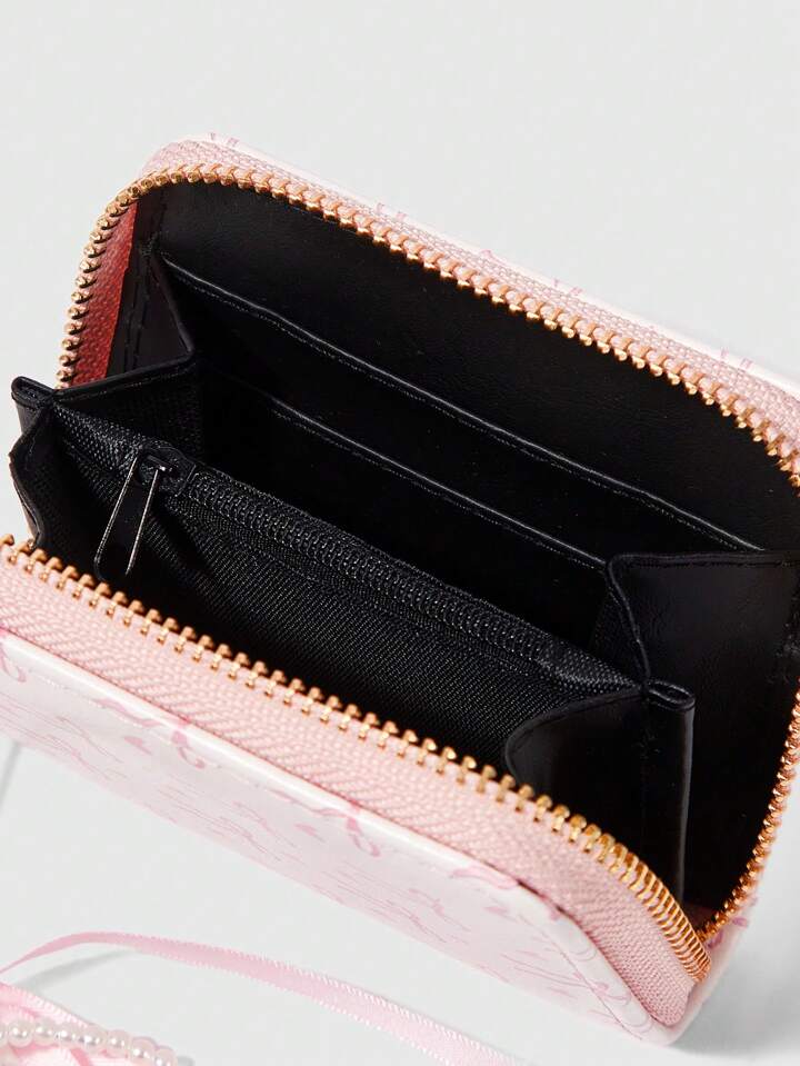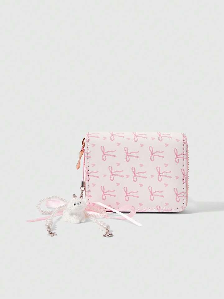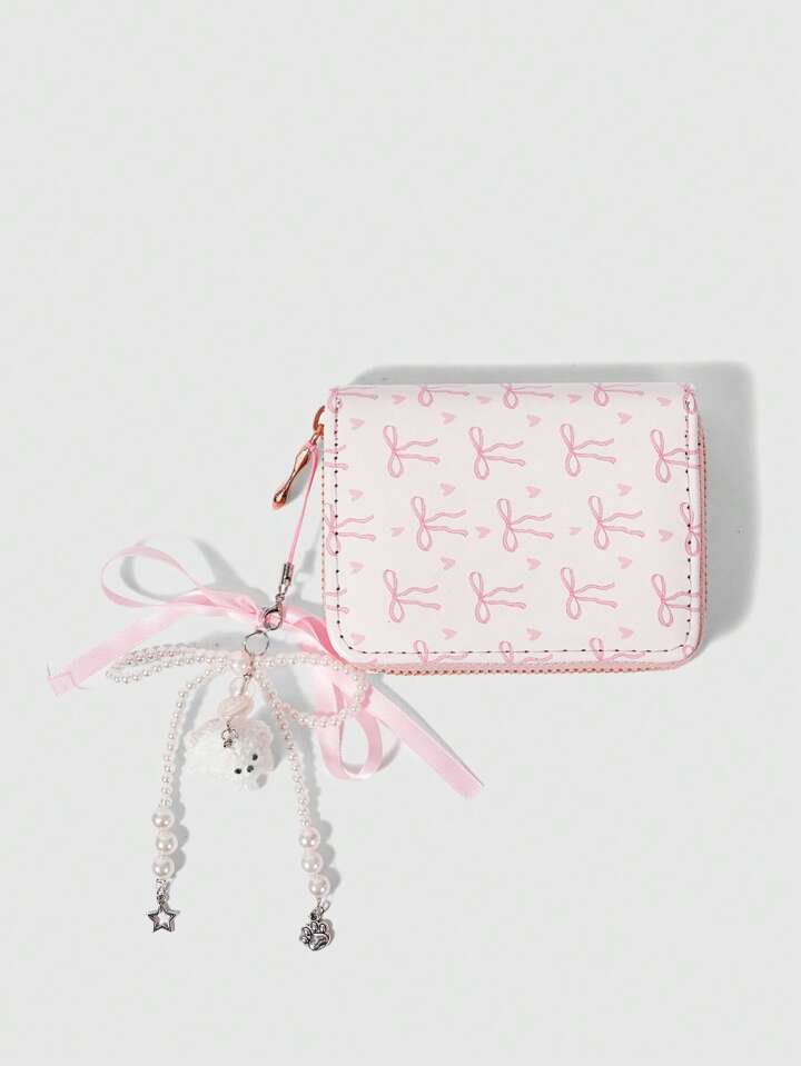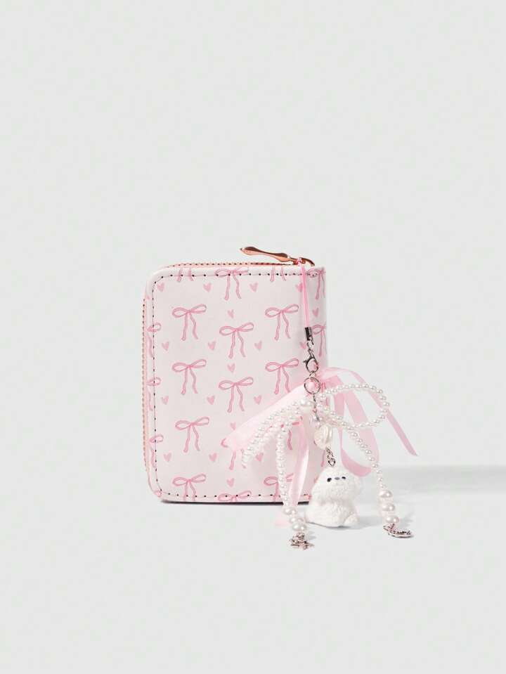 Kawaii Cartera corta con colgante de osito de peluche con lazo rosa sobre base rosa, cartera creativa multifuncional con ranuras para tarjetas