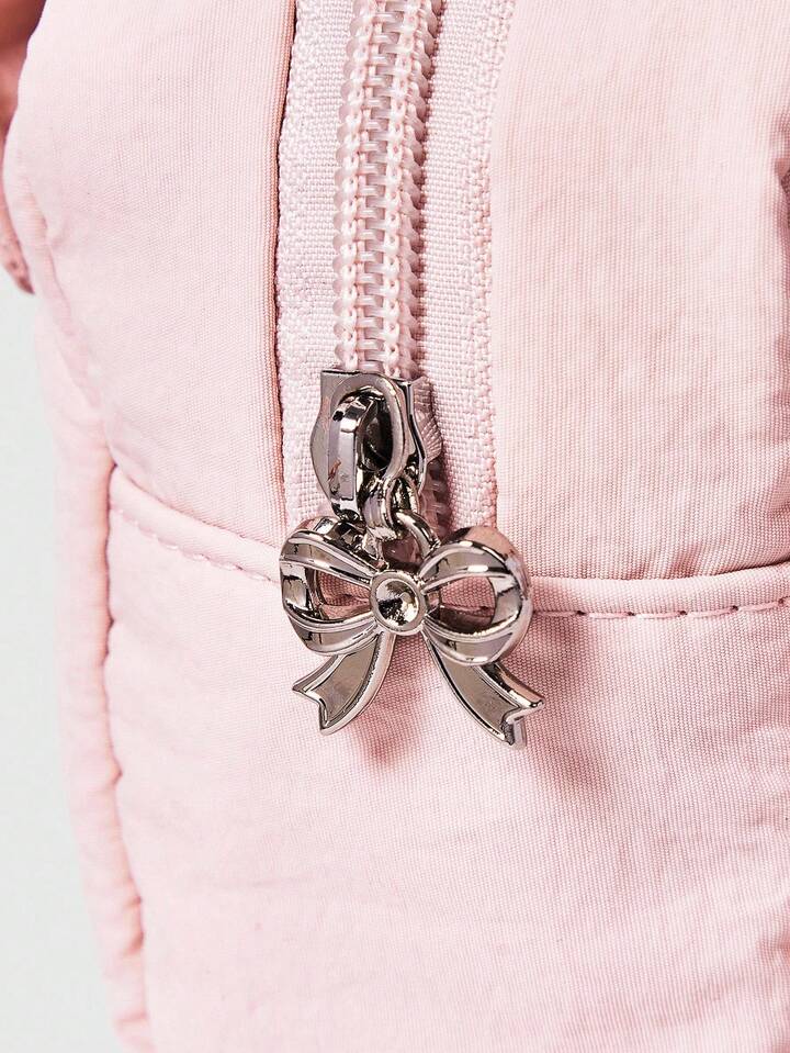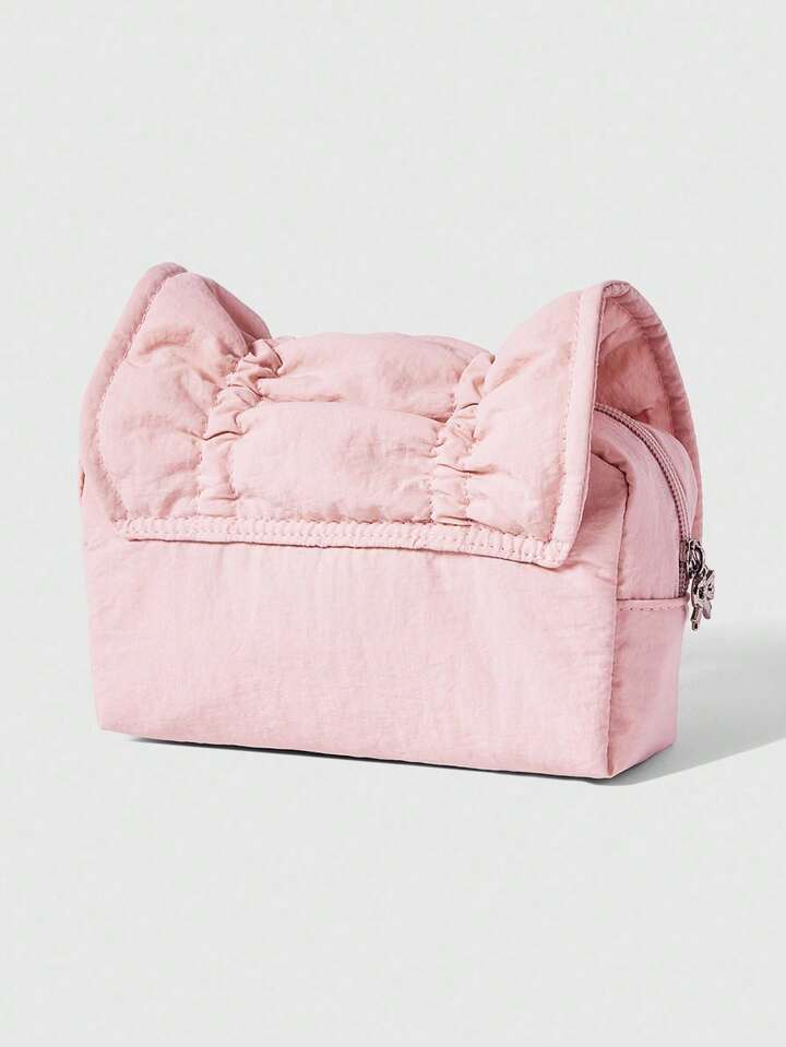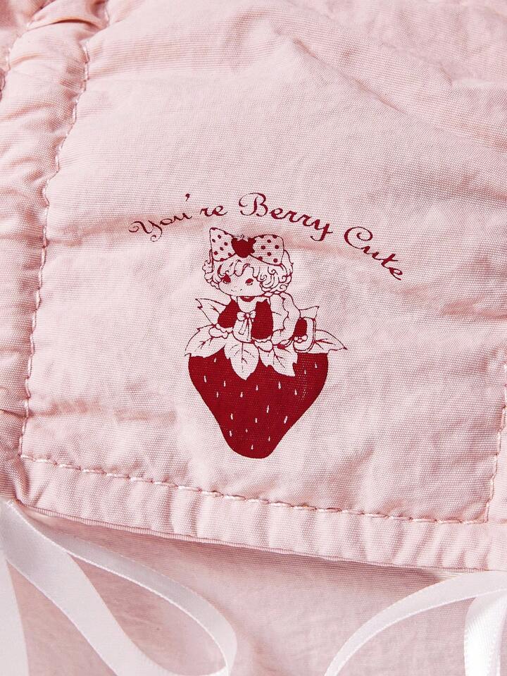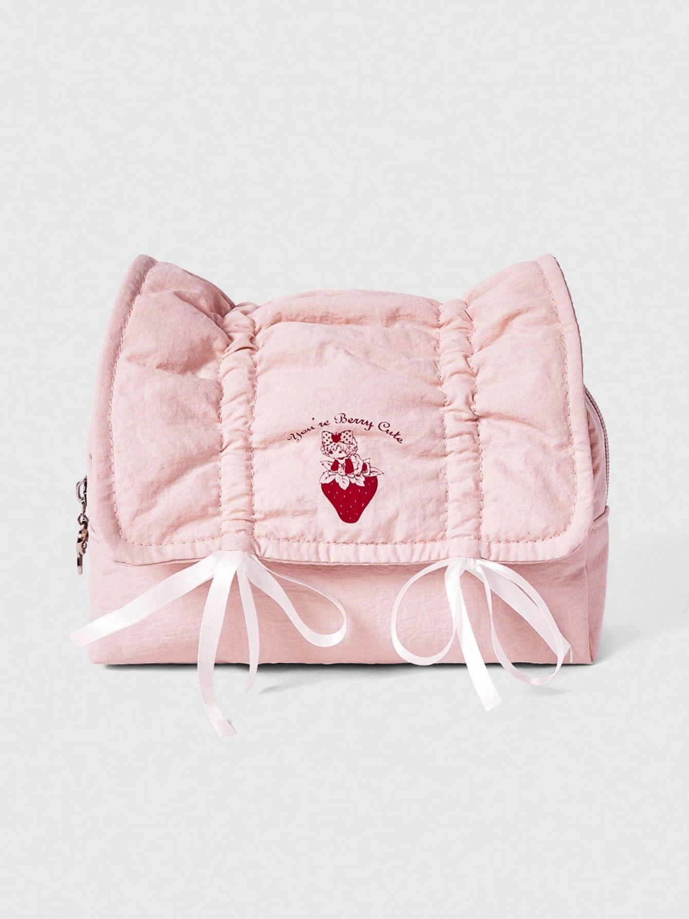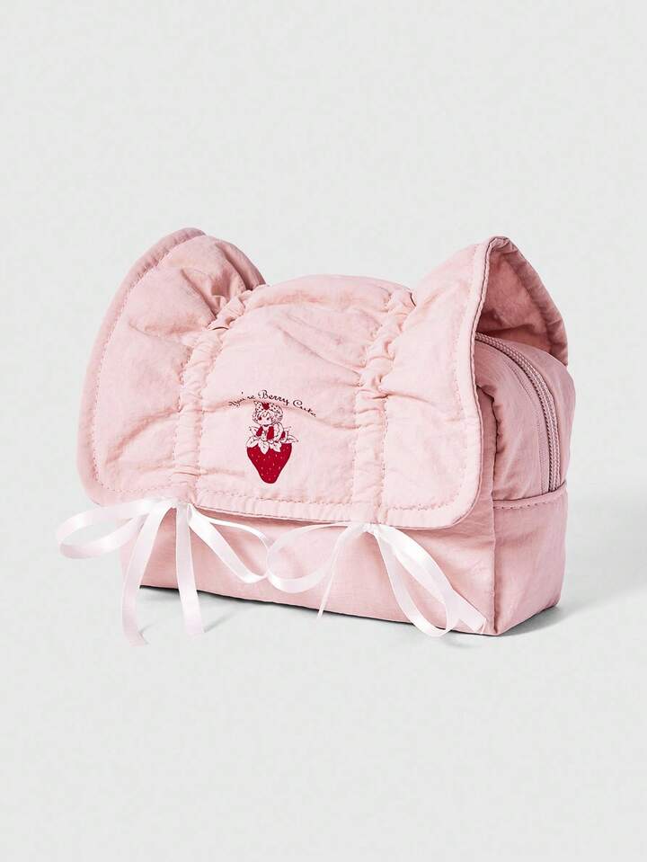 Kawaii Bolsa de cosméticos y estuche de lápices portátil de gran capacidad con cordón, lazo y diseño de fresa en color rosa
