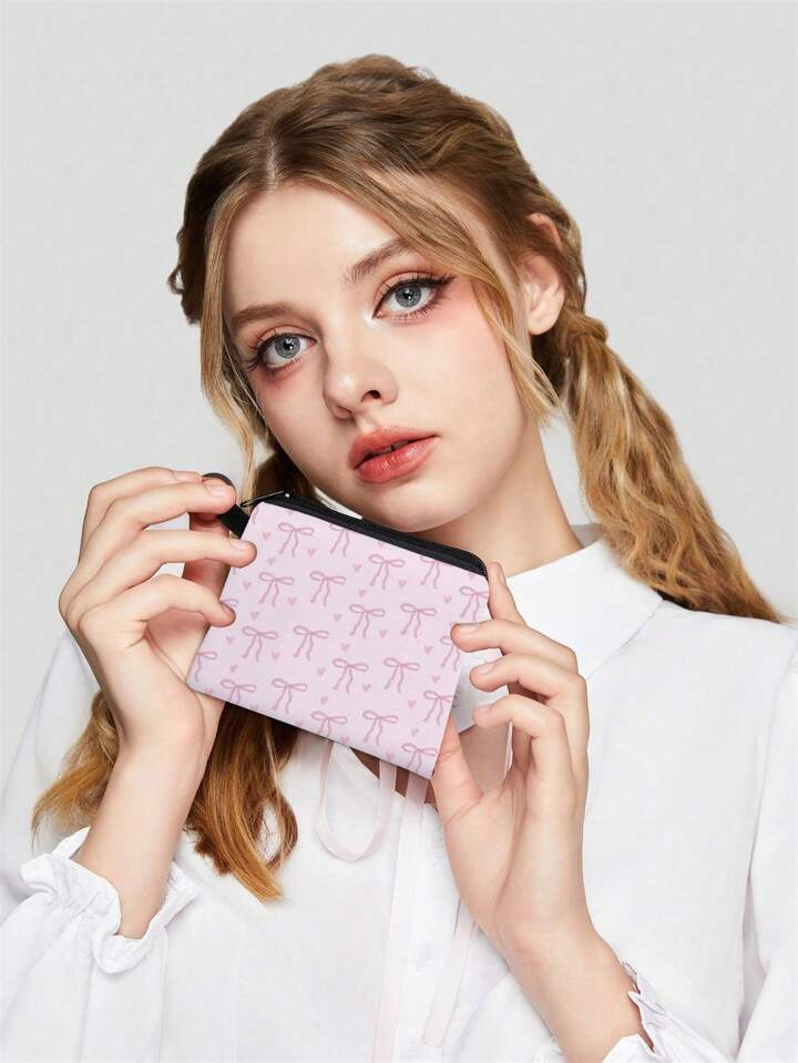 Kawaii Monedero con cremallera portátil de poliéster con diseño de cinta rosa, billetera pequeña para cambio de dama, regalo para vacaciones
