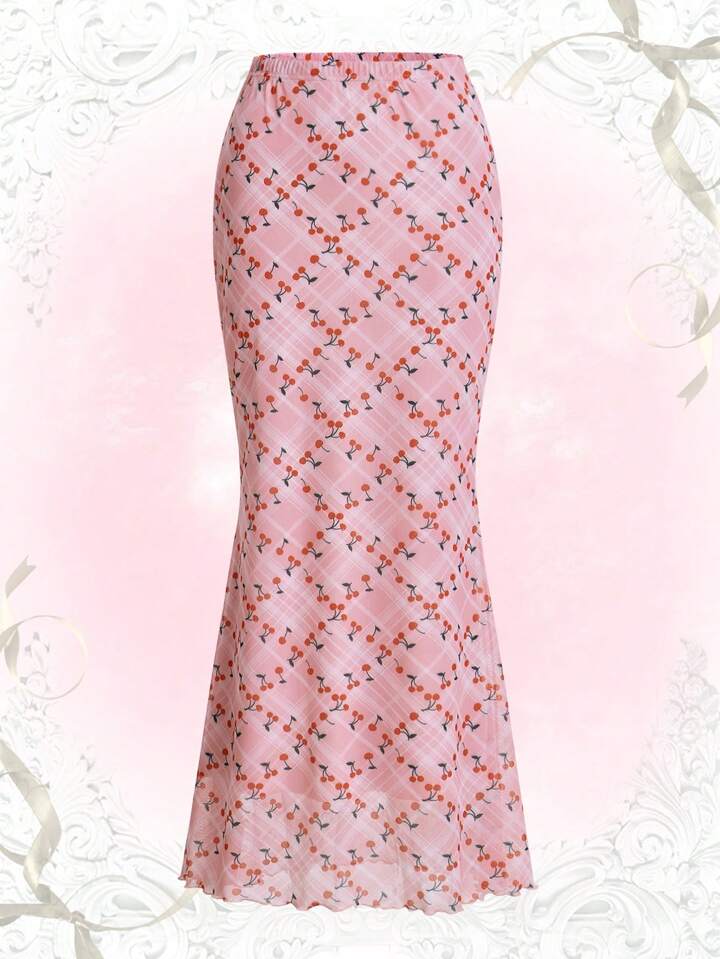 Kawaii Falda bajo de sirena de cuadros con estampado de cereza