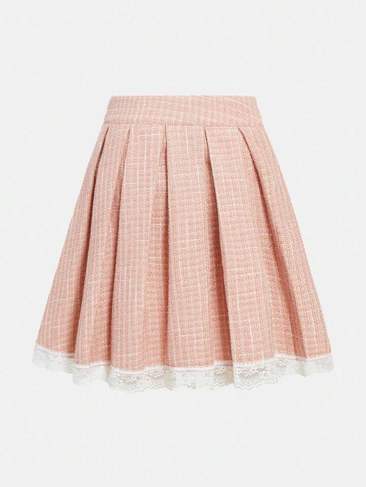 Kawaii Falda fruncido con estampado de cuadros ribete con encaje