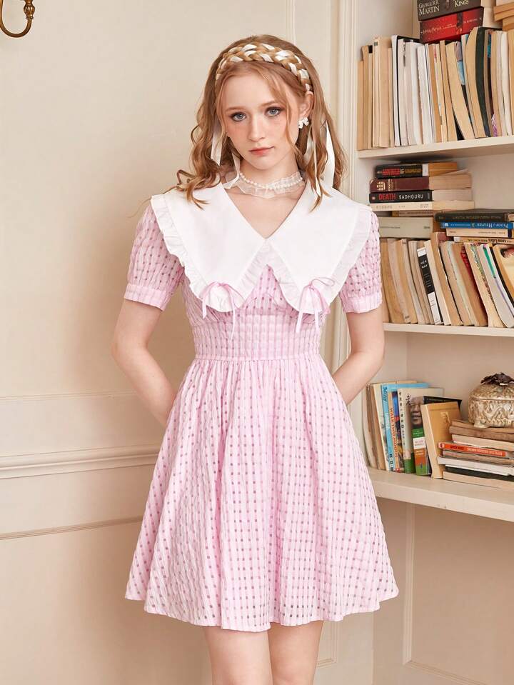 Kawaii Vestido de cuadros de cuello exagerado de manga farol