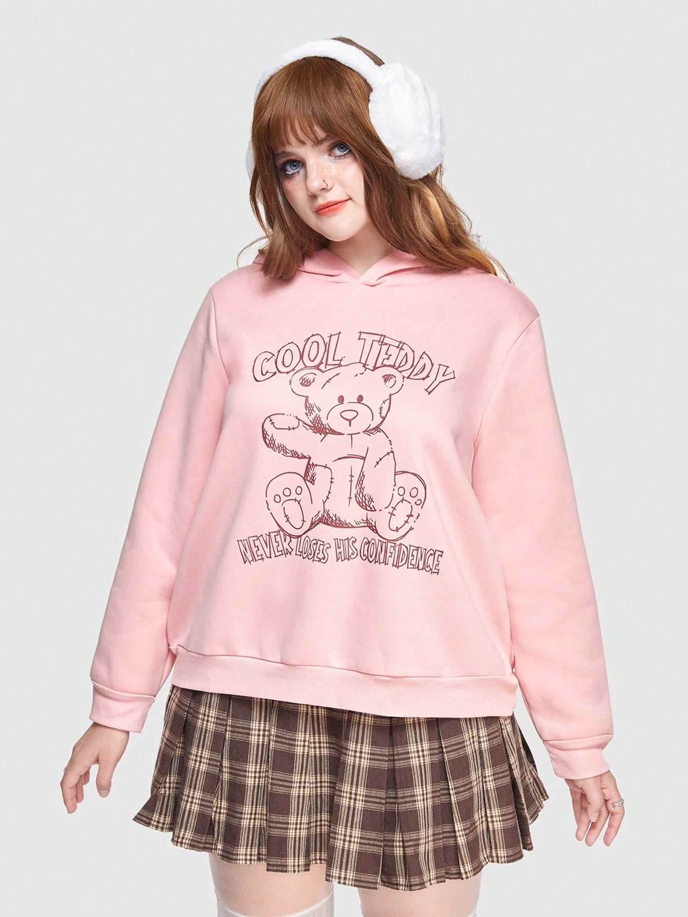 Kawaii Talla grande Capucha con estampado de oso y letra de hombros caídos