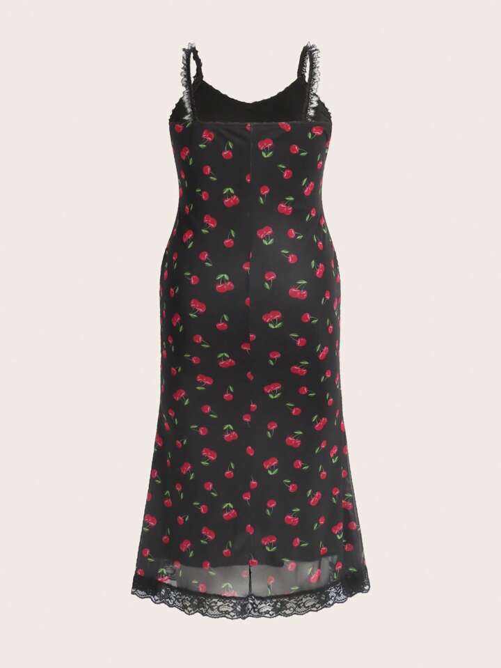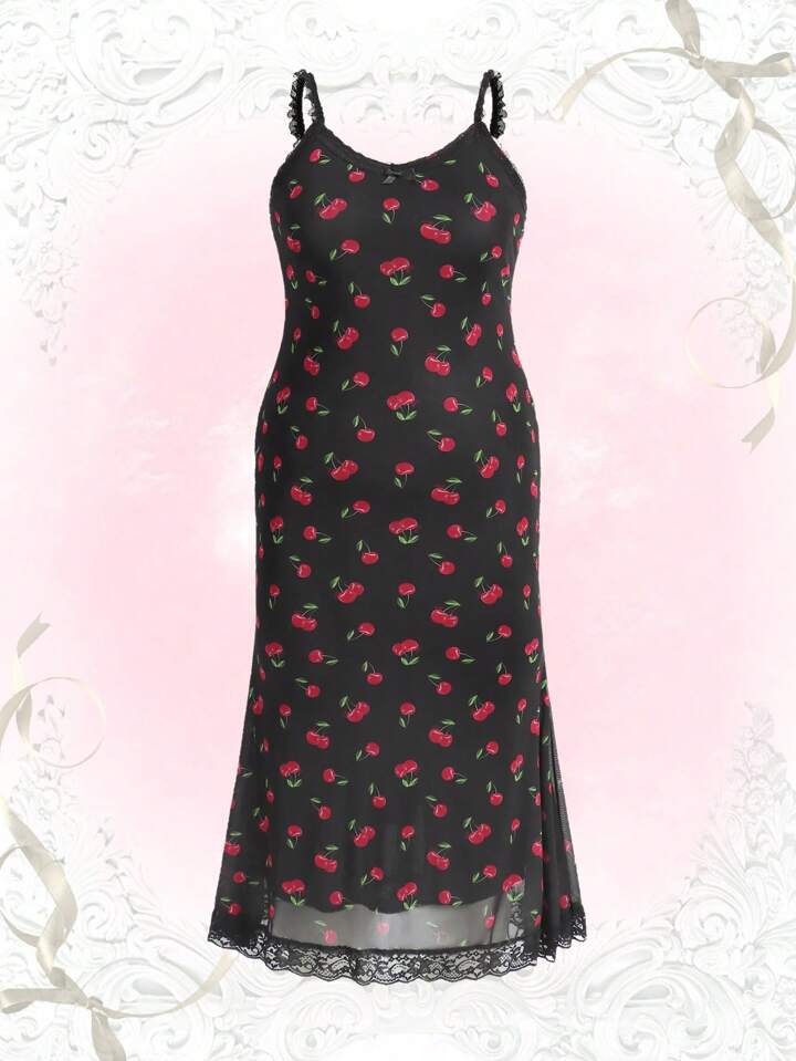 Kawaii Talla grande Vestido de tirantes con estampado de cereza con encaje en contraste
