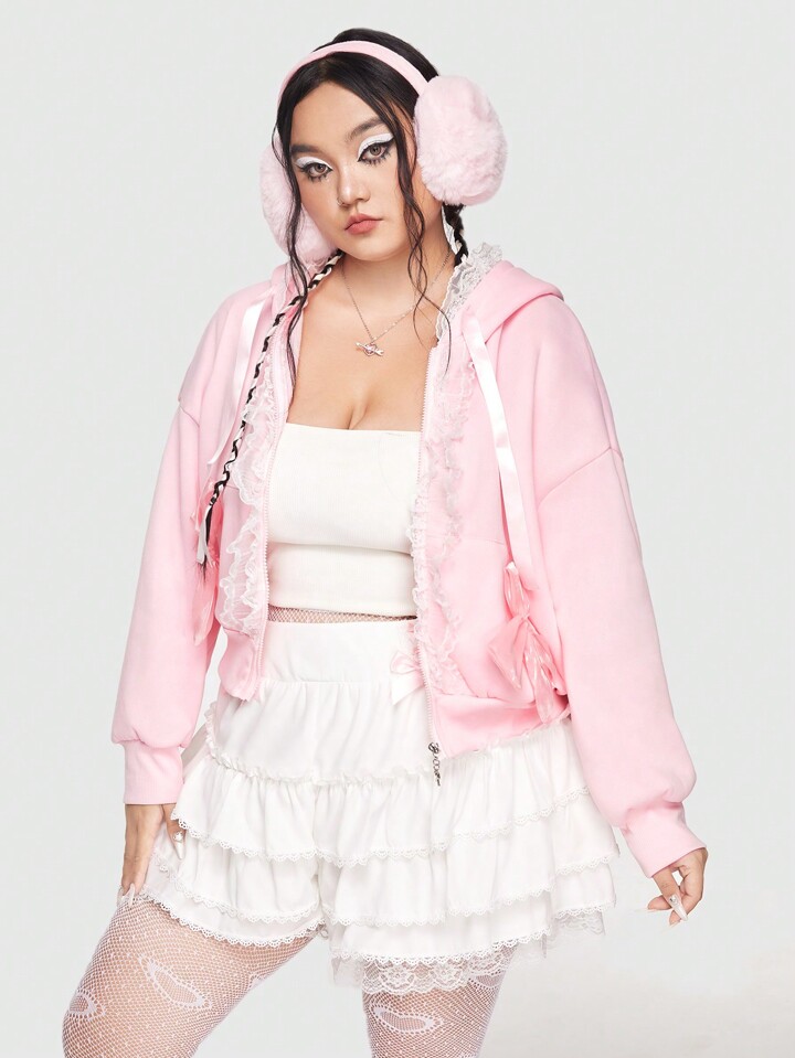 Kawaii Talla grande Capucha con encaje en contraste con lazo delantero de hombros caídos con cordón