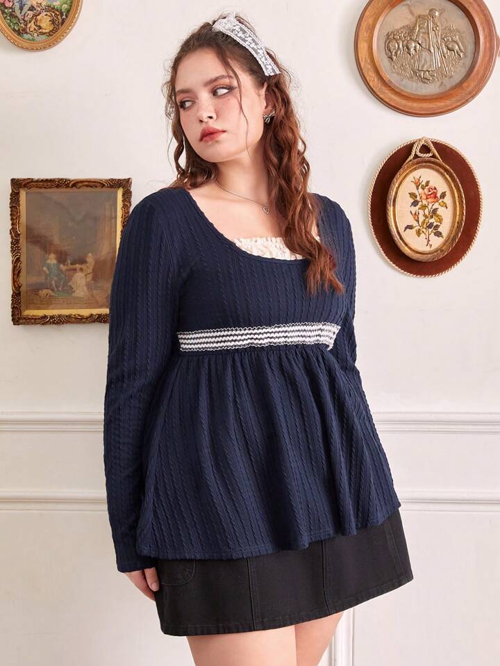 Kawaii Camiseta de mujer tipo babydoll con contraste de encaje y volante, para la escuela
