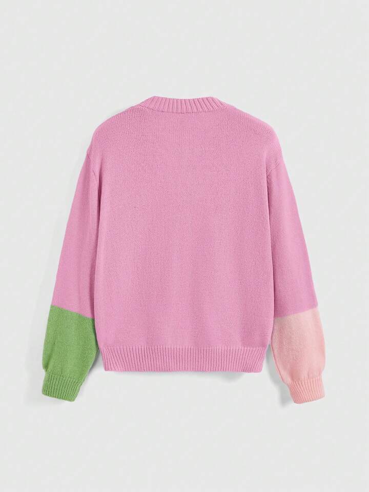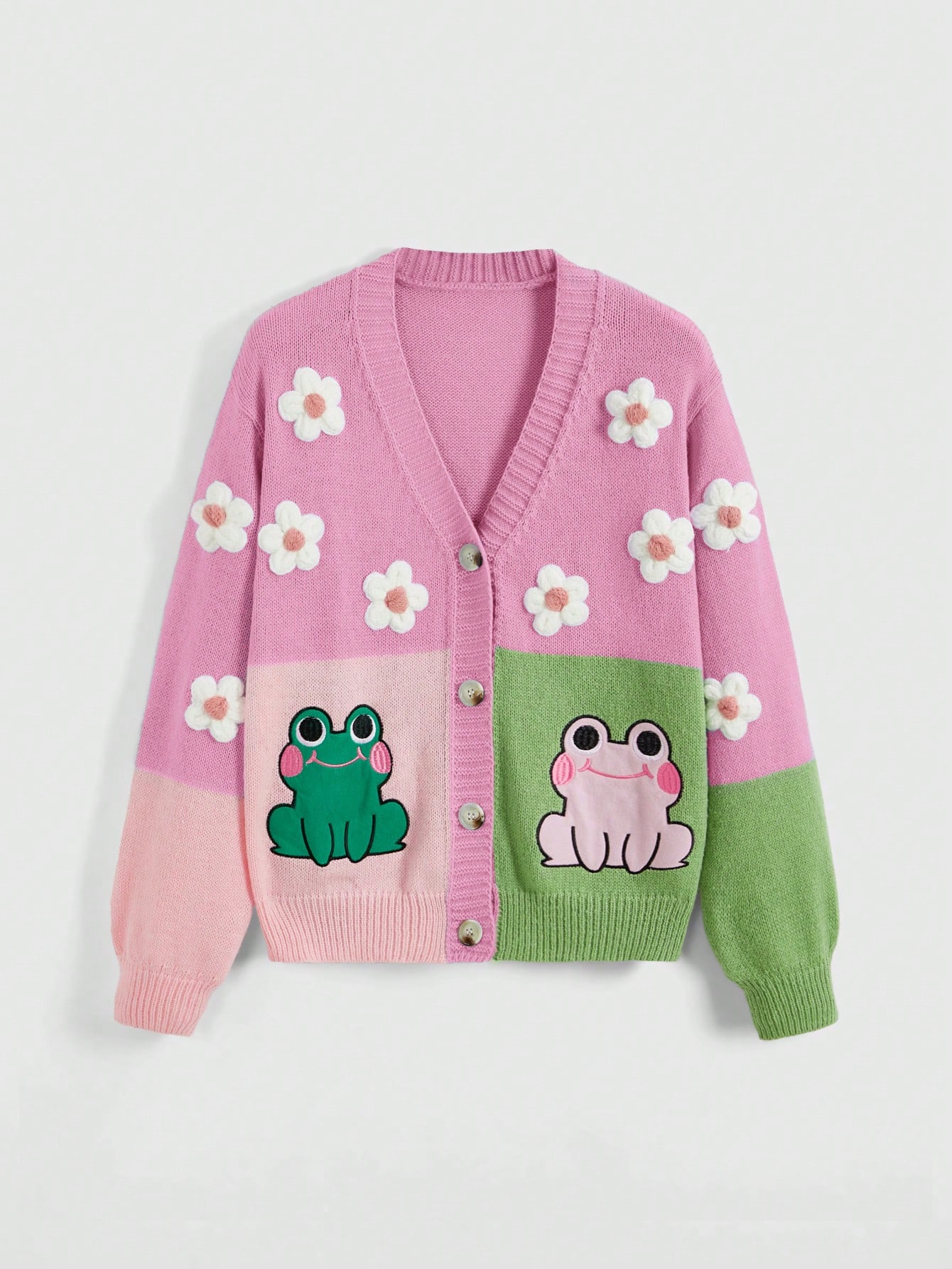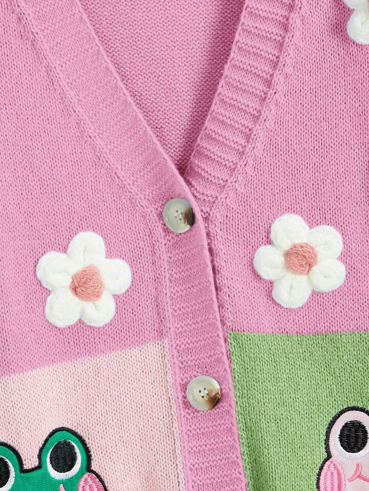 Kawaii Cárdigan de talla grande con bordado de rana linda y aplicación de flores en bloque de color