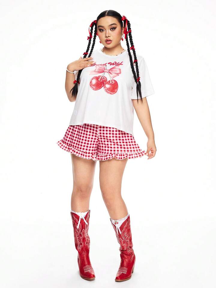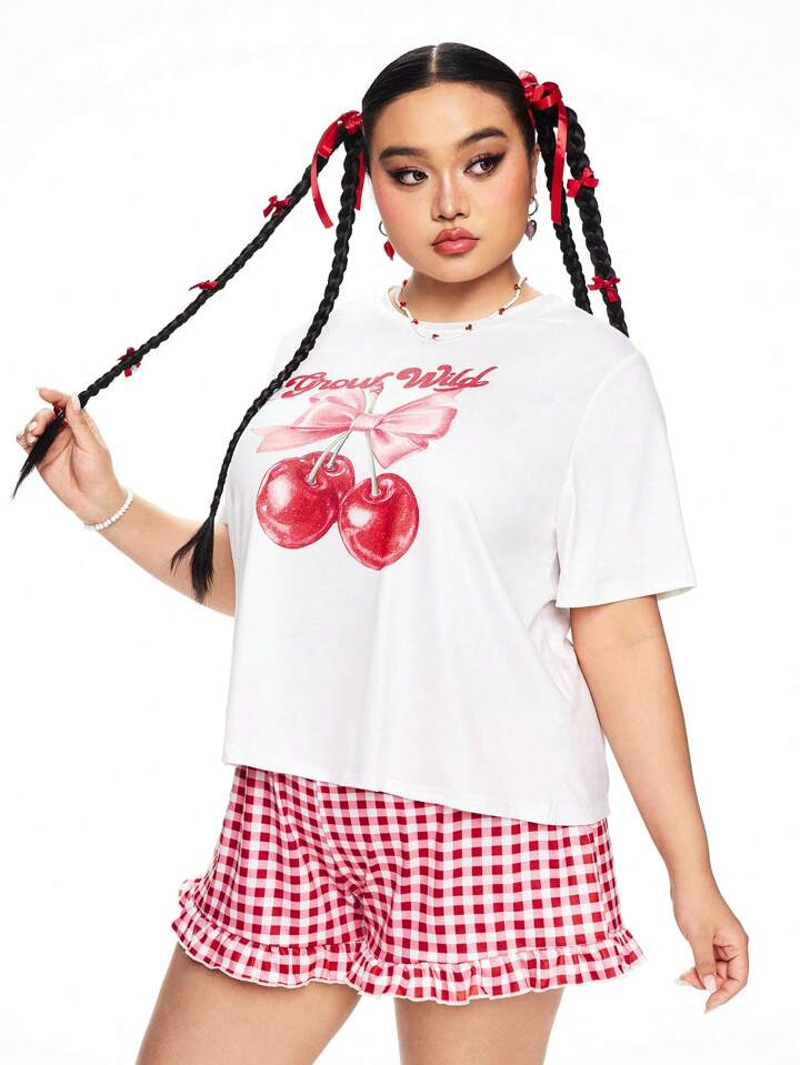 Kawaii Conjunto de pijama informal con estampado de cerezas, blusa de manga corta y short a cuadros para tallas grandes