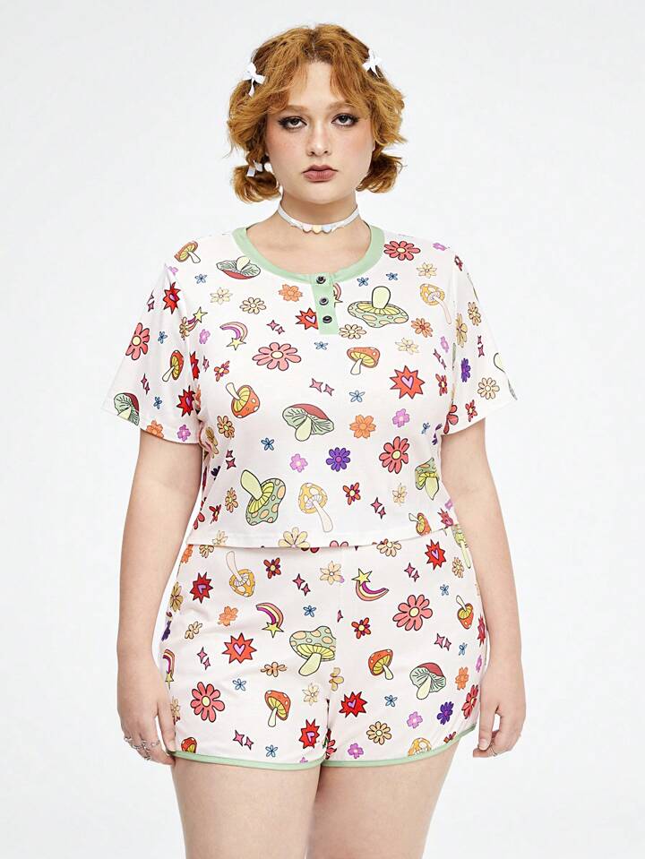 Kawaii Conjunto de pijama de talla grande y cómodo con champiñones y flores arcoíris con mangas cortas y botones, ideal para estar en casa y para el ocio