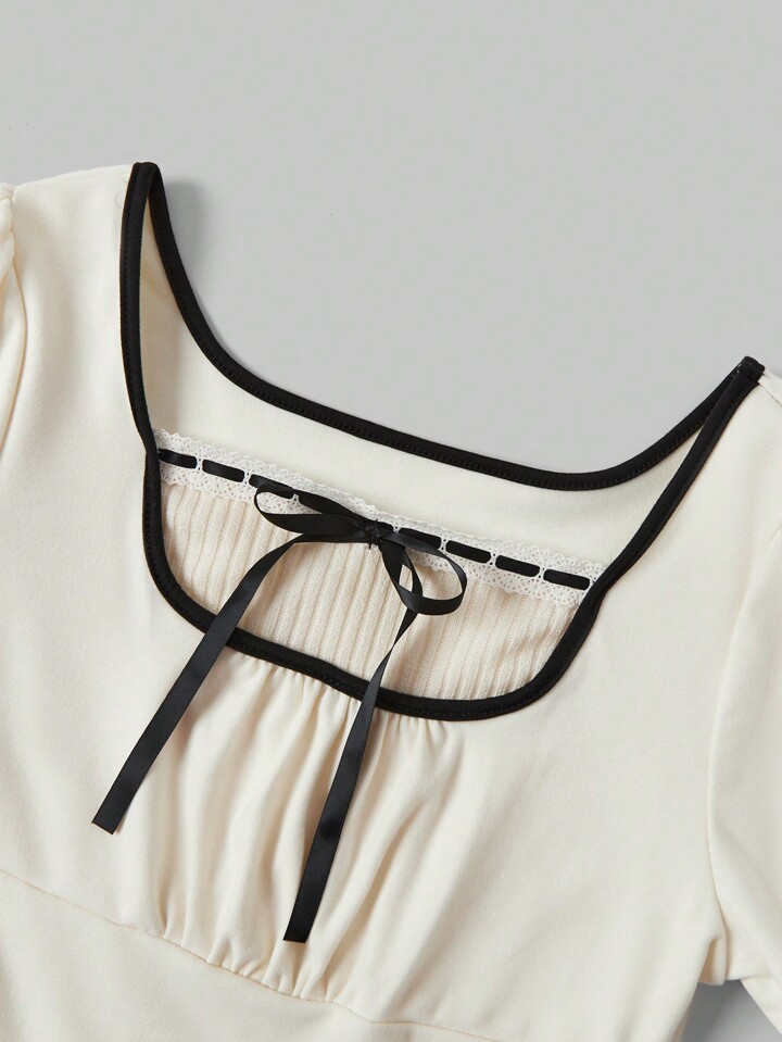 Kawaii Vestido de talla grande con cuello cuadrado de contraste y decoración de lazo para mujeres, verano