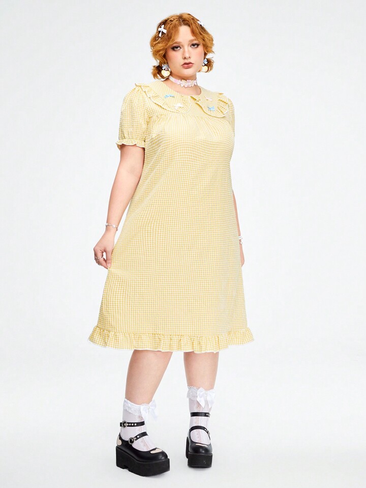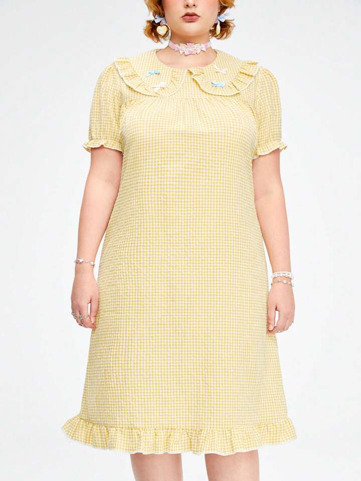 Kawaii Vestido con cuello Peter Pan, lazada, volantes en el bajo y estampado de cuadros para tallas grandes
