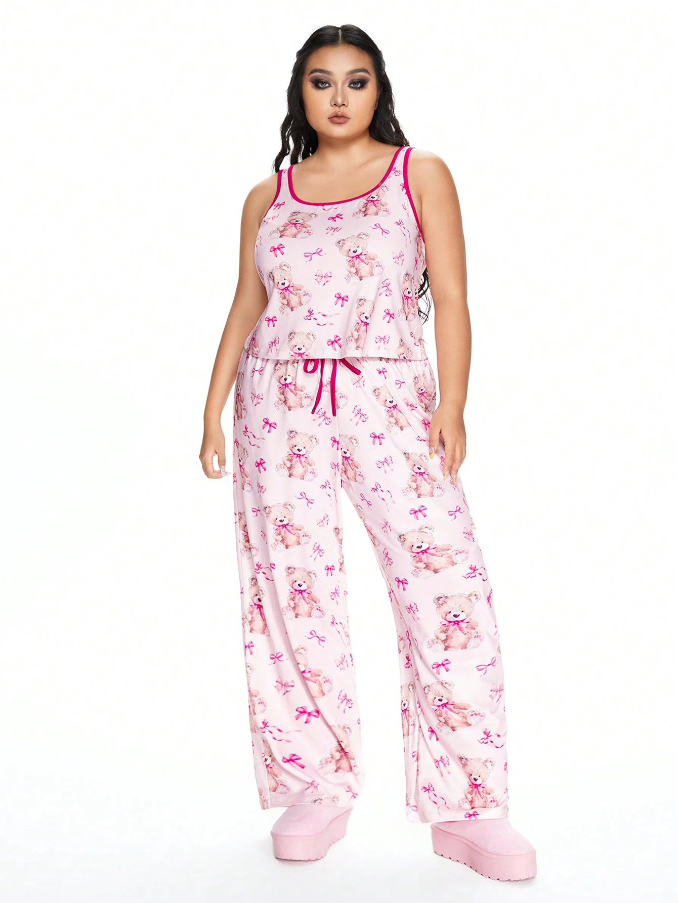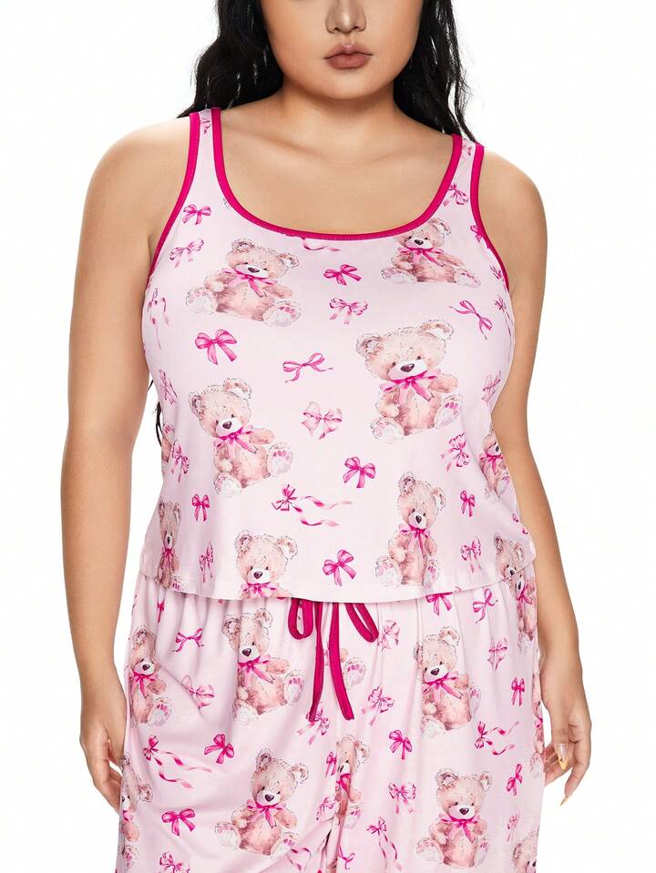Kawaii Conjunto de camisola y pijama informal con bloques de color, lazo y diseño de oso de peluche lindo para talla grande