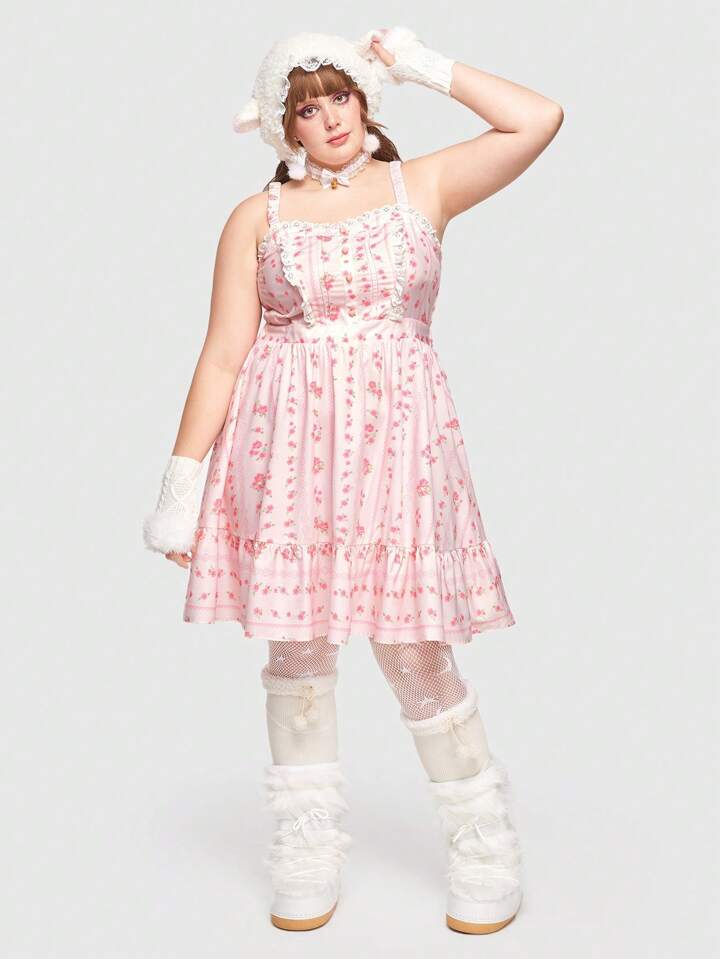 Kawaii Talla grande Vestido con estampado floral de color combinado bajo con fruncido con tira espagueti