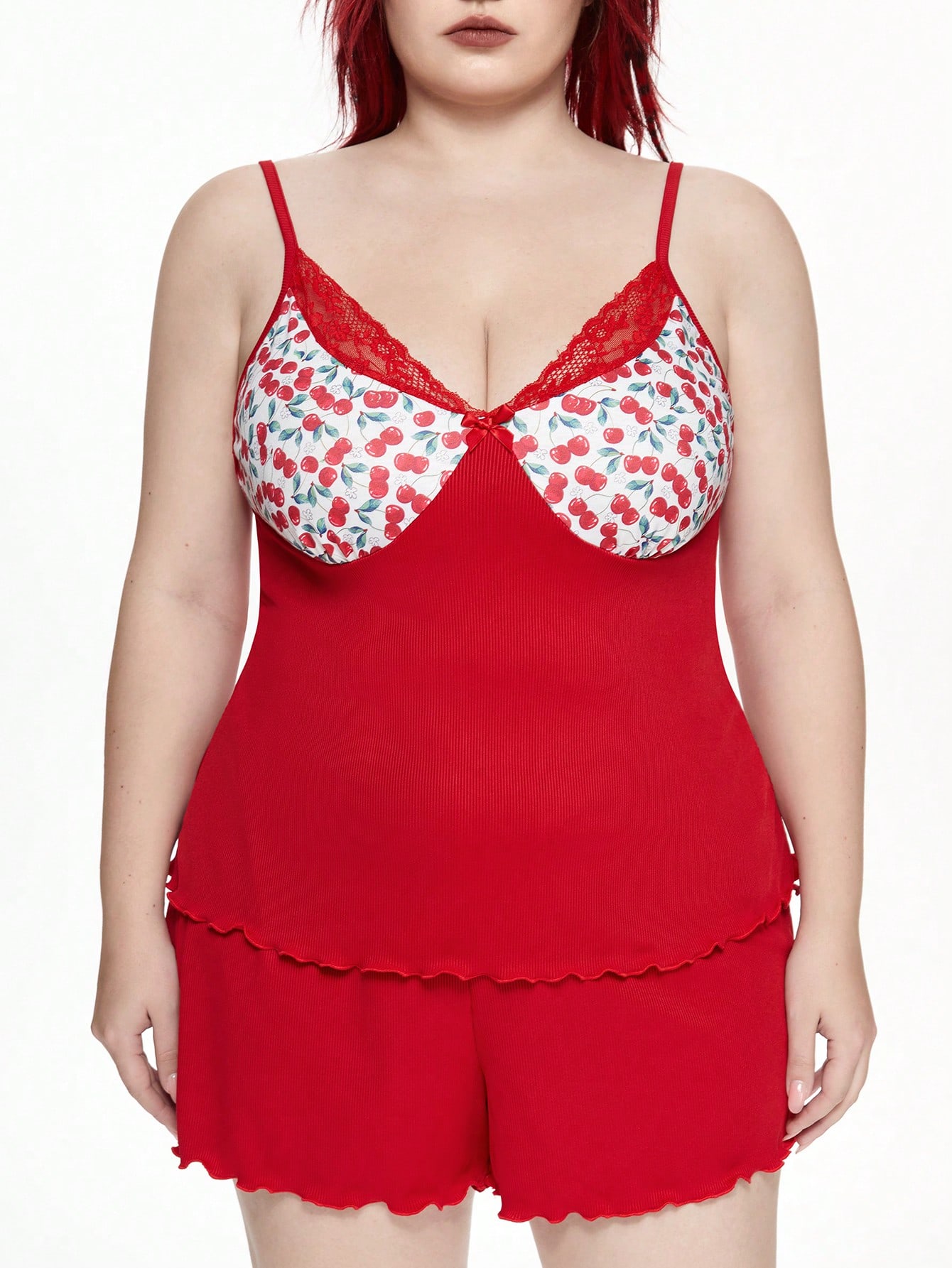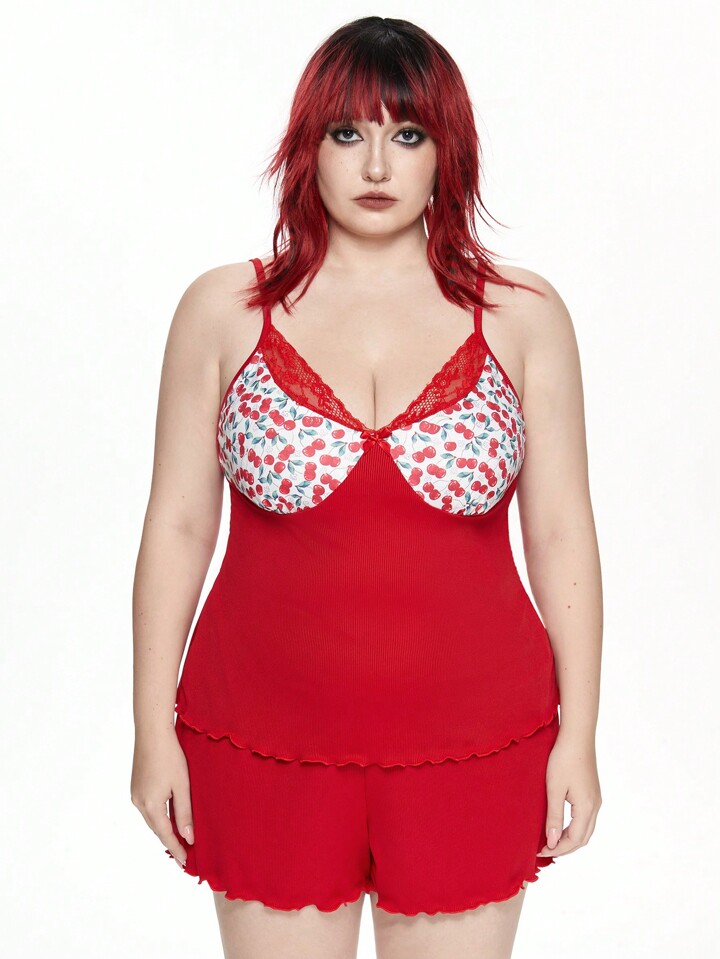 Kawaii Conjunto de pijama con camisola con parche de encaje acanalado y lazo en talla grande