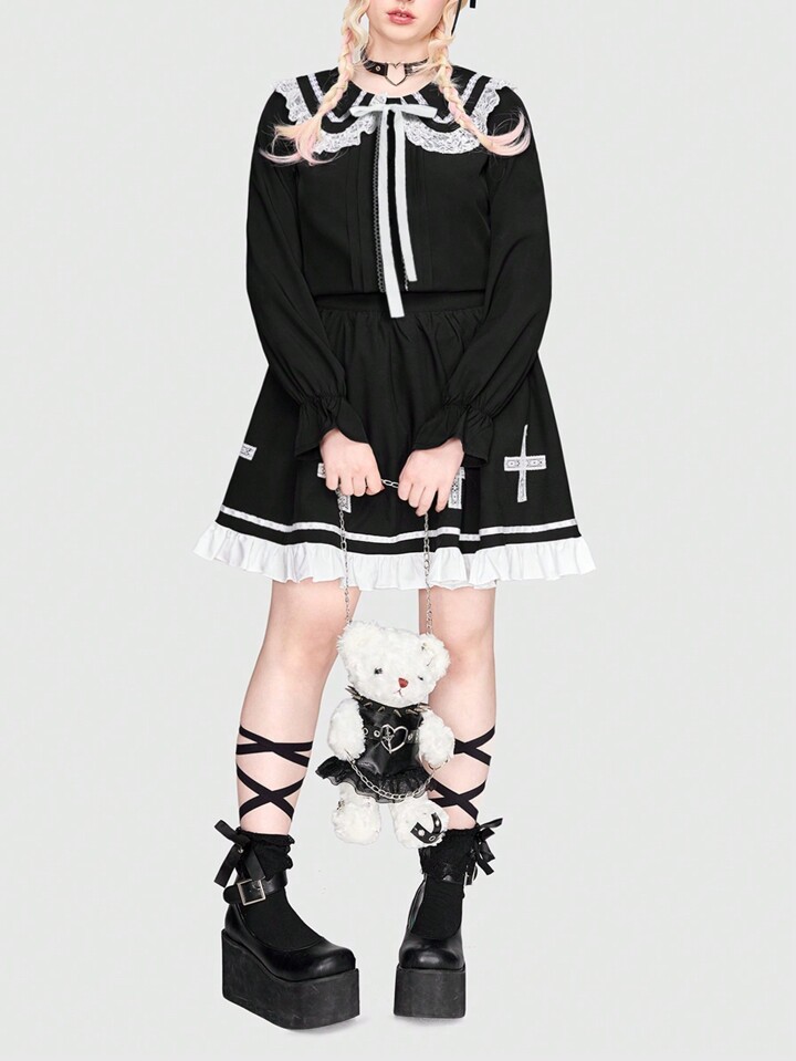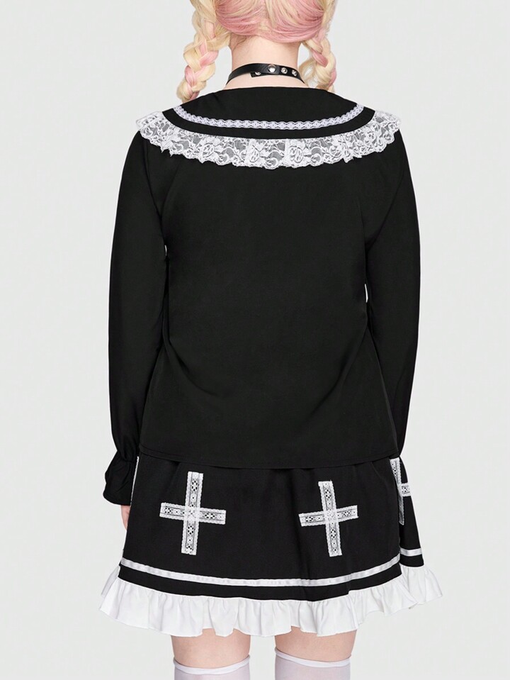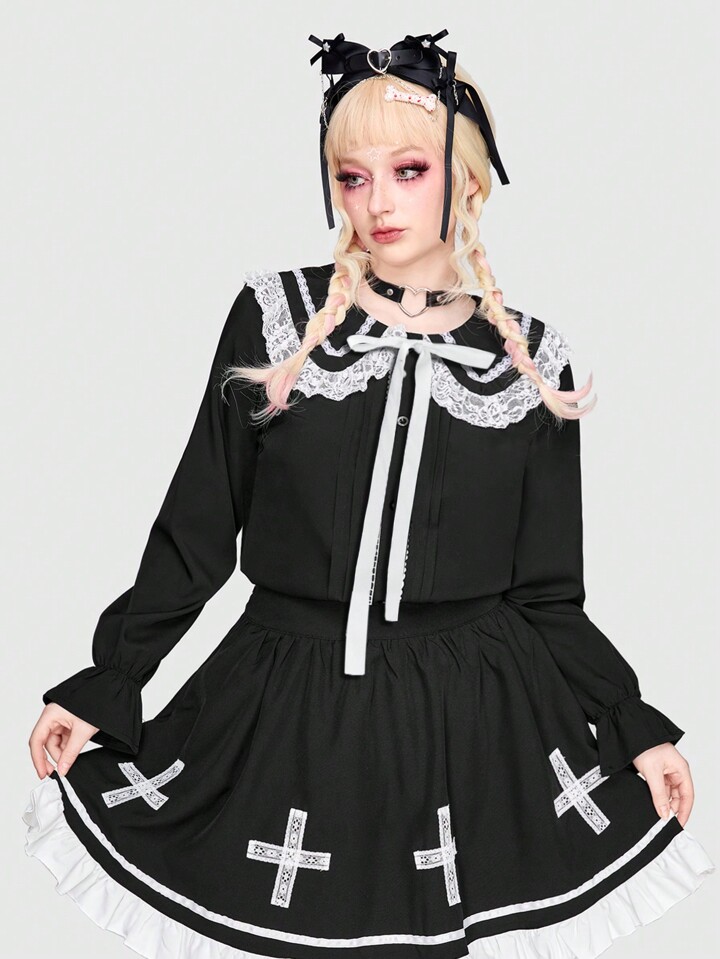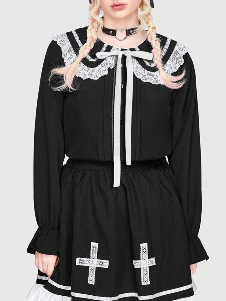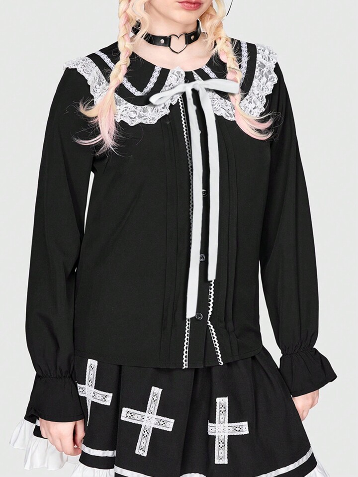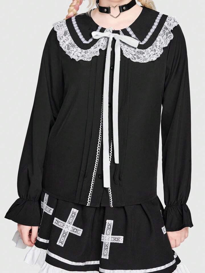 Kawaii Blusa De Talla Grande Con Ribete De Encaje Y Lazo En La Parte Delantera