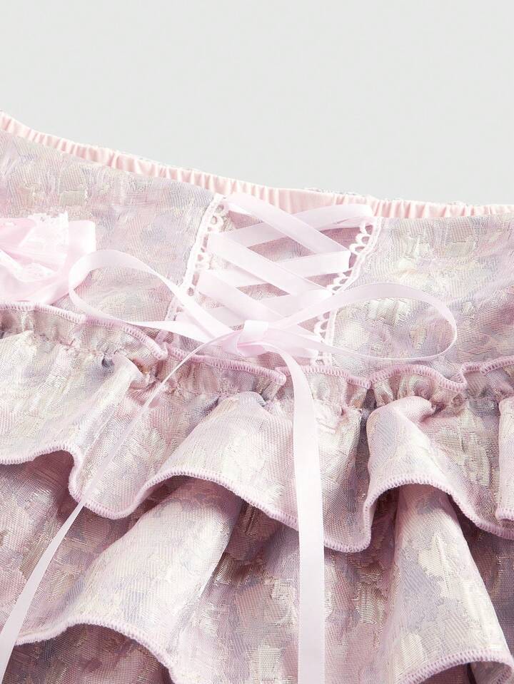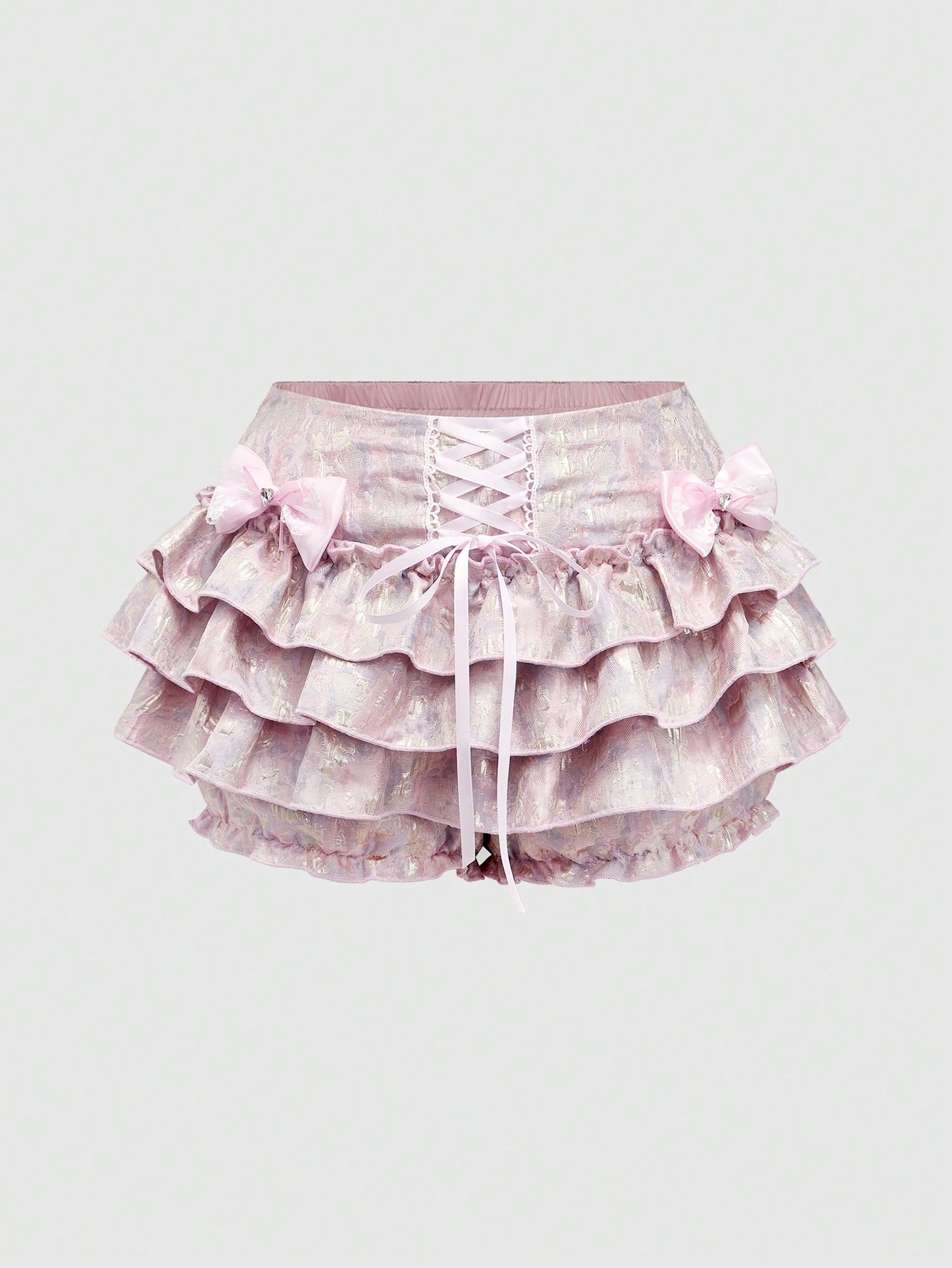 Kawaii Shorts de talla grande con lazo de tela jacquard vintage con decoración de volantes