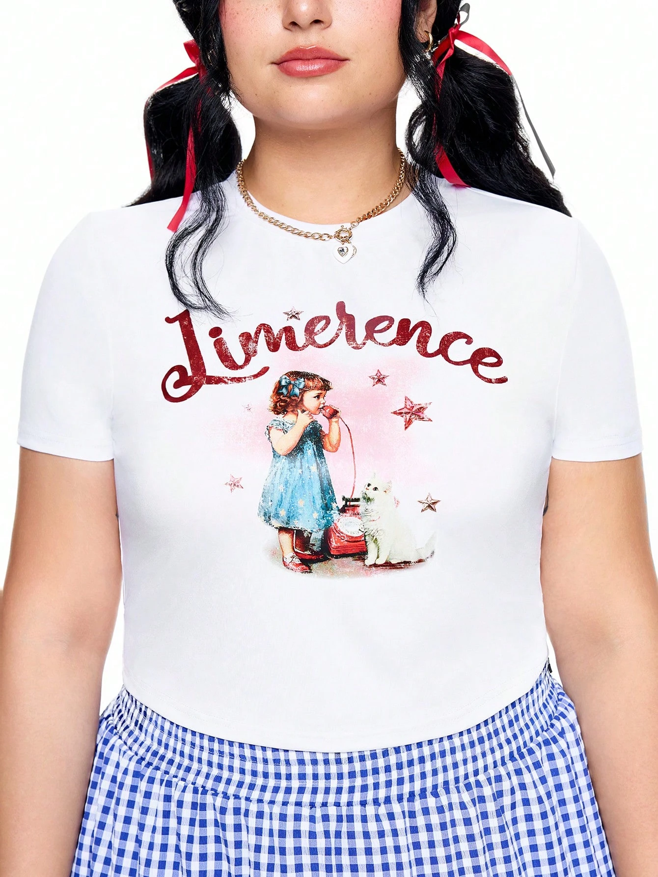 Kawaii Camiseta ajustada de manga corta para mujer talla grande con estampado de letras y niña de dibujos animados