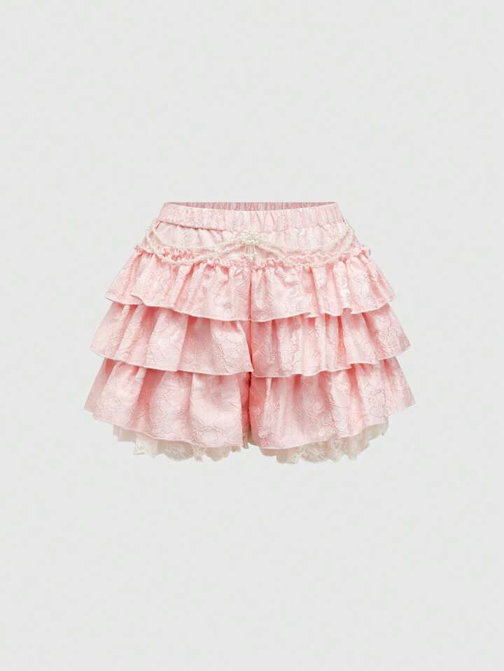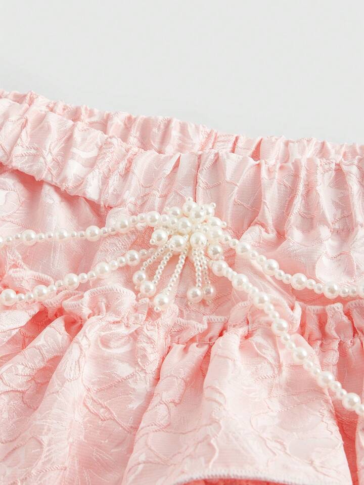 Kawaii Short de mujer talla grande con textura de satén retro romántico, remiendo y colgante de perla