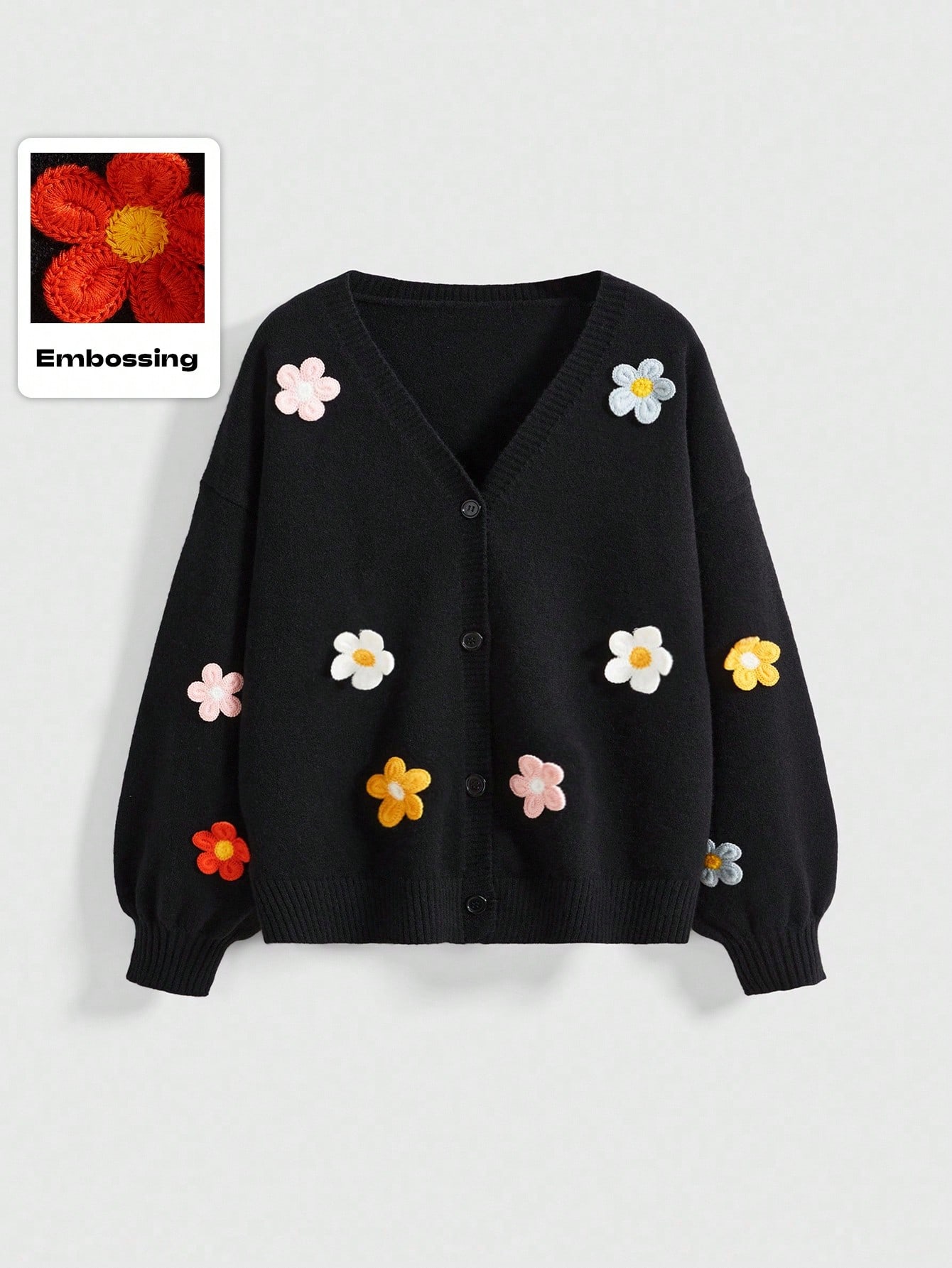 Kawaii Cárdigan holgado de punto floral 3D con cuello en V y mangas farol para mujer talla grande, color negro, estilo dulce y casual, vintage