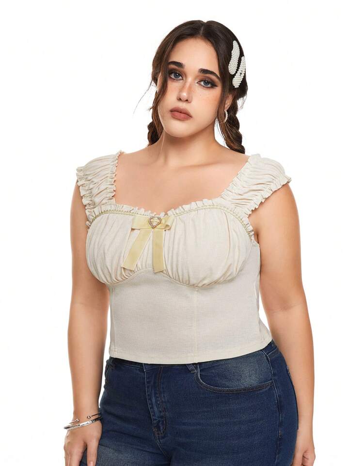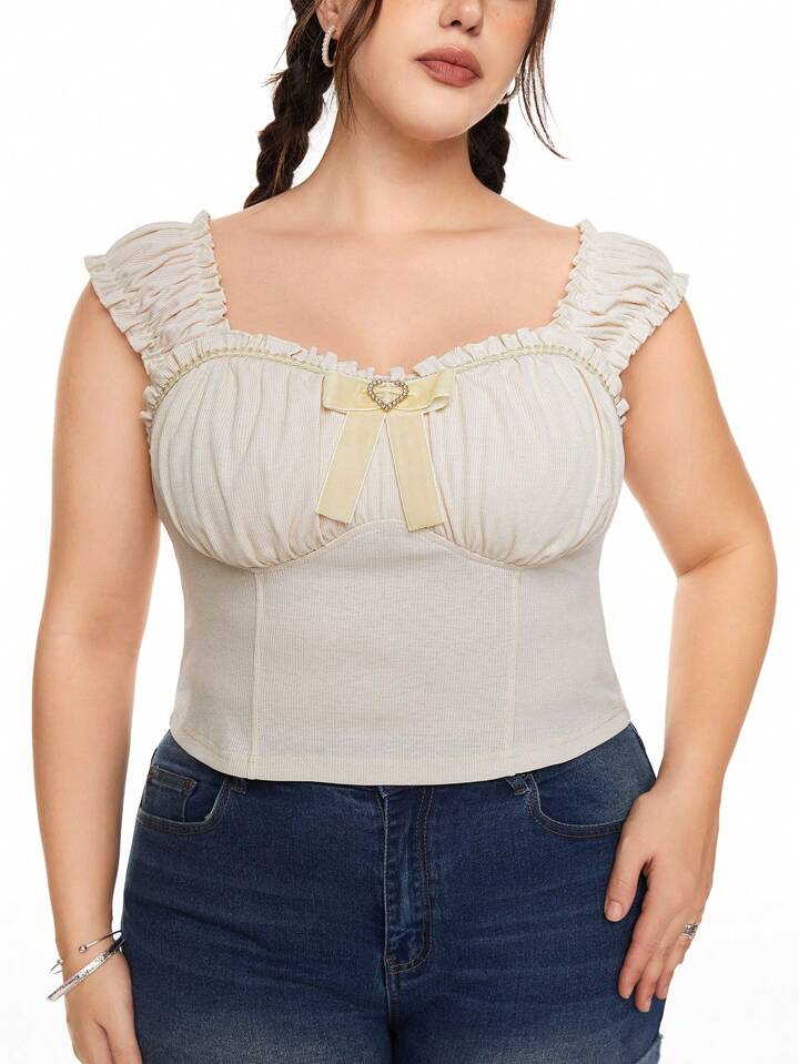 Kawaii Camiseta casual sencilla de unicolor con volantes y decoración de lazo para mujer talla grande