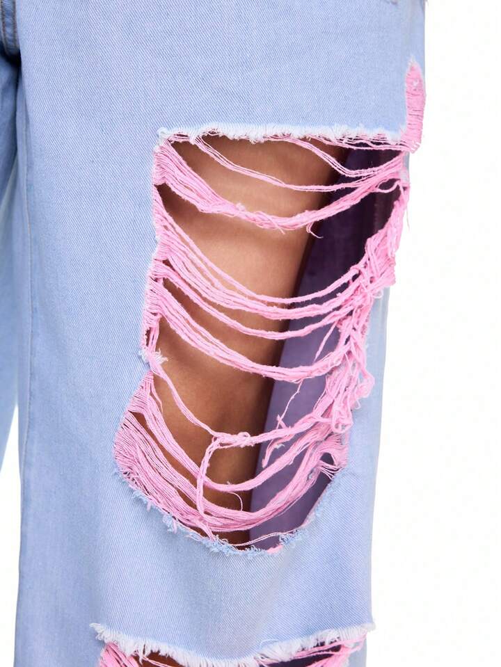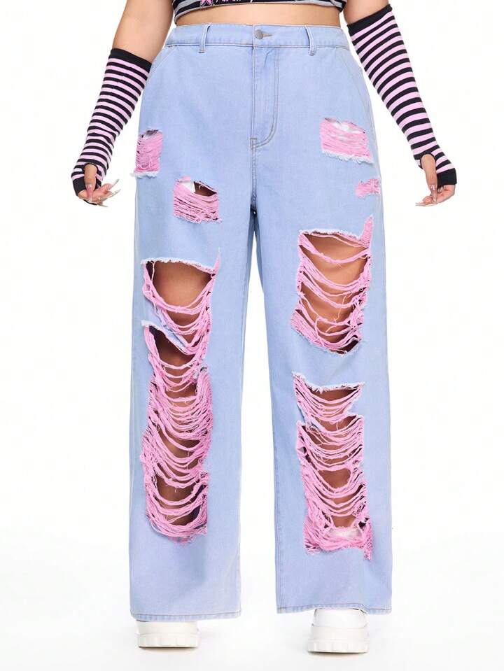 Kawaii Jeans casuales holgados con bolsillos y desgastados para mujer de talla grande
