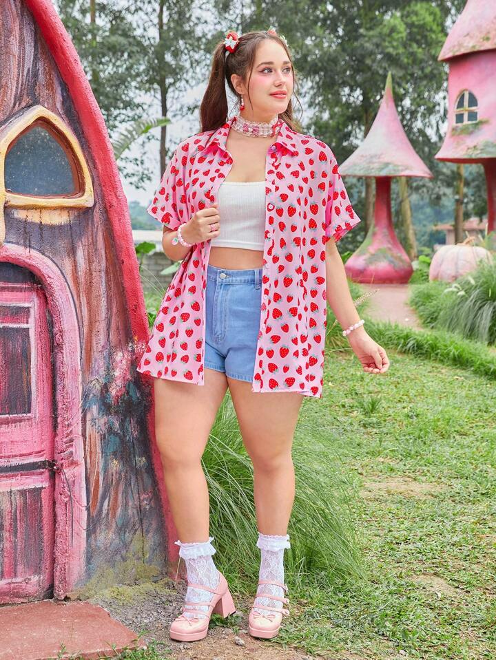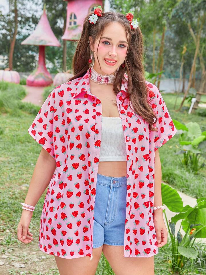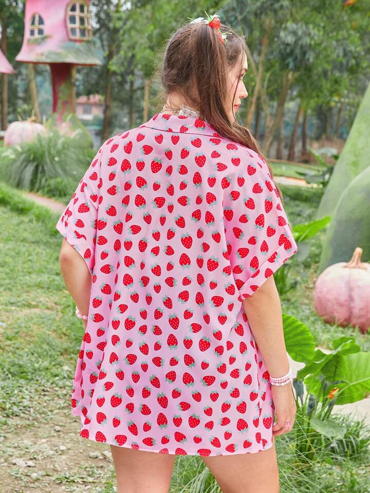 Kawaii Talla grande Camisa con estampado de fresa de manga murciélago