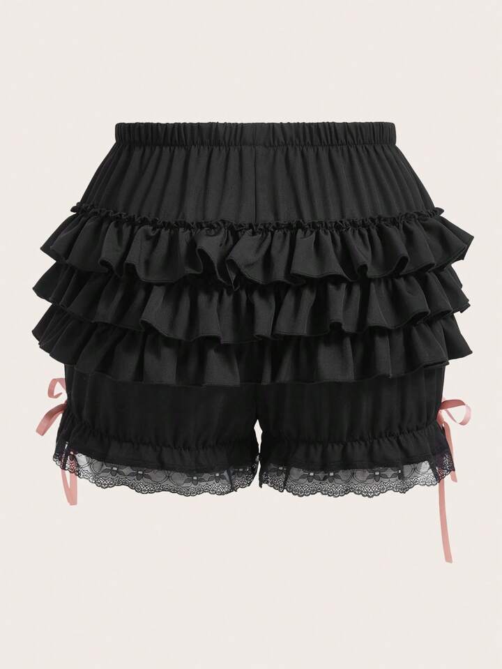 Kawaii Pantalones cortos con cintura con cordón, volantes y dobladillo de encaje, para la escuela, talla grande