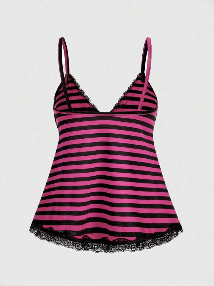 Kawaii Camiseta de tirantes con escote en V, estilo punk sexy Y2K, de bloque de color y rayas, con encaje, camiseta de verano