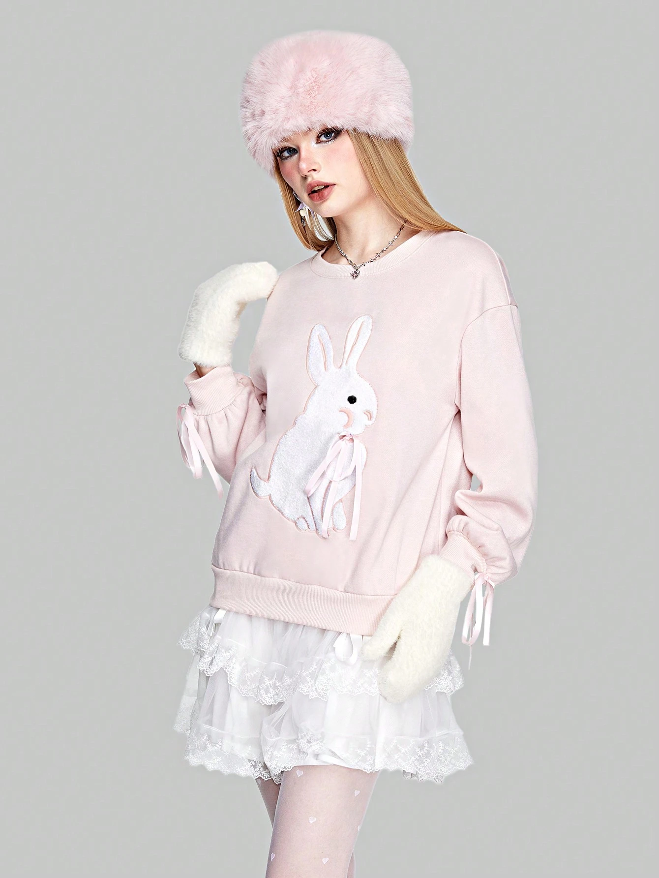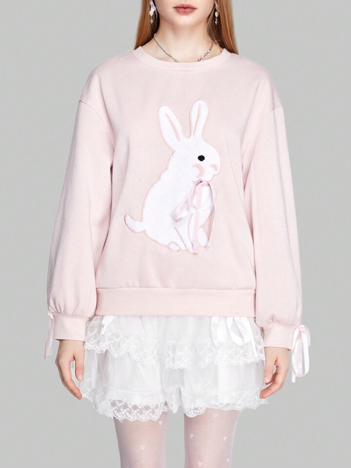 Kawaii Sudadera conejo con bordado de hombros caídos